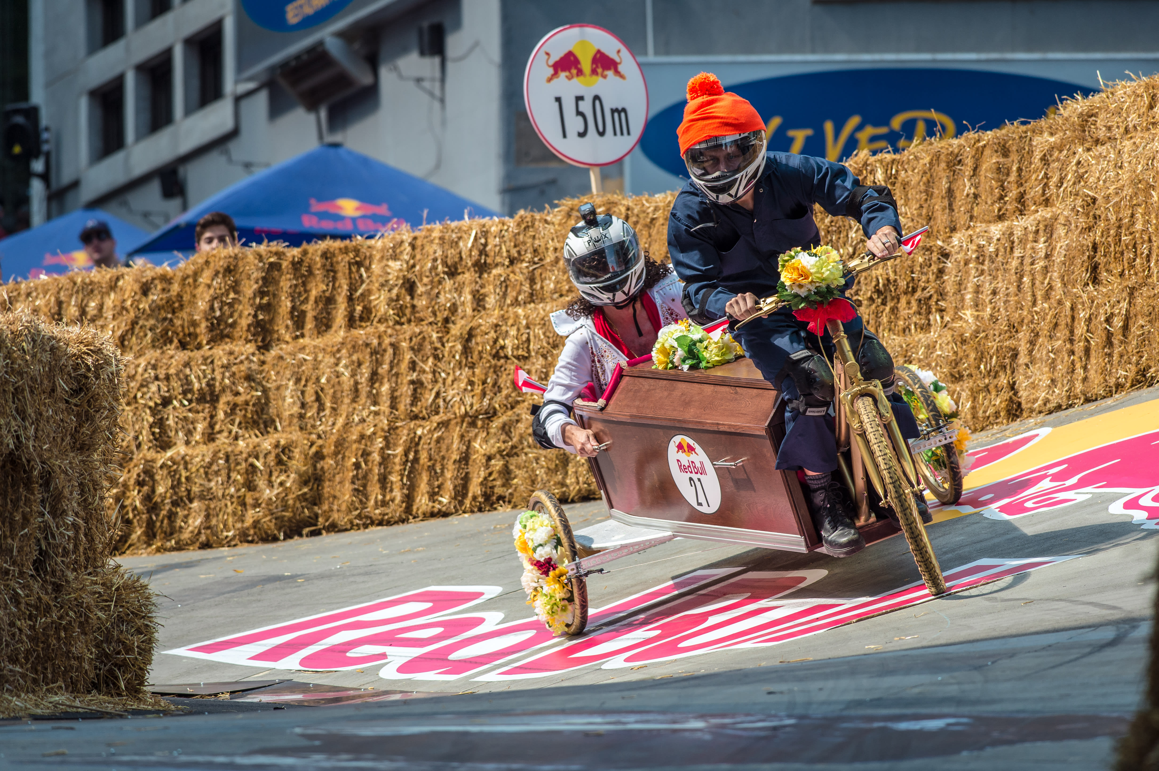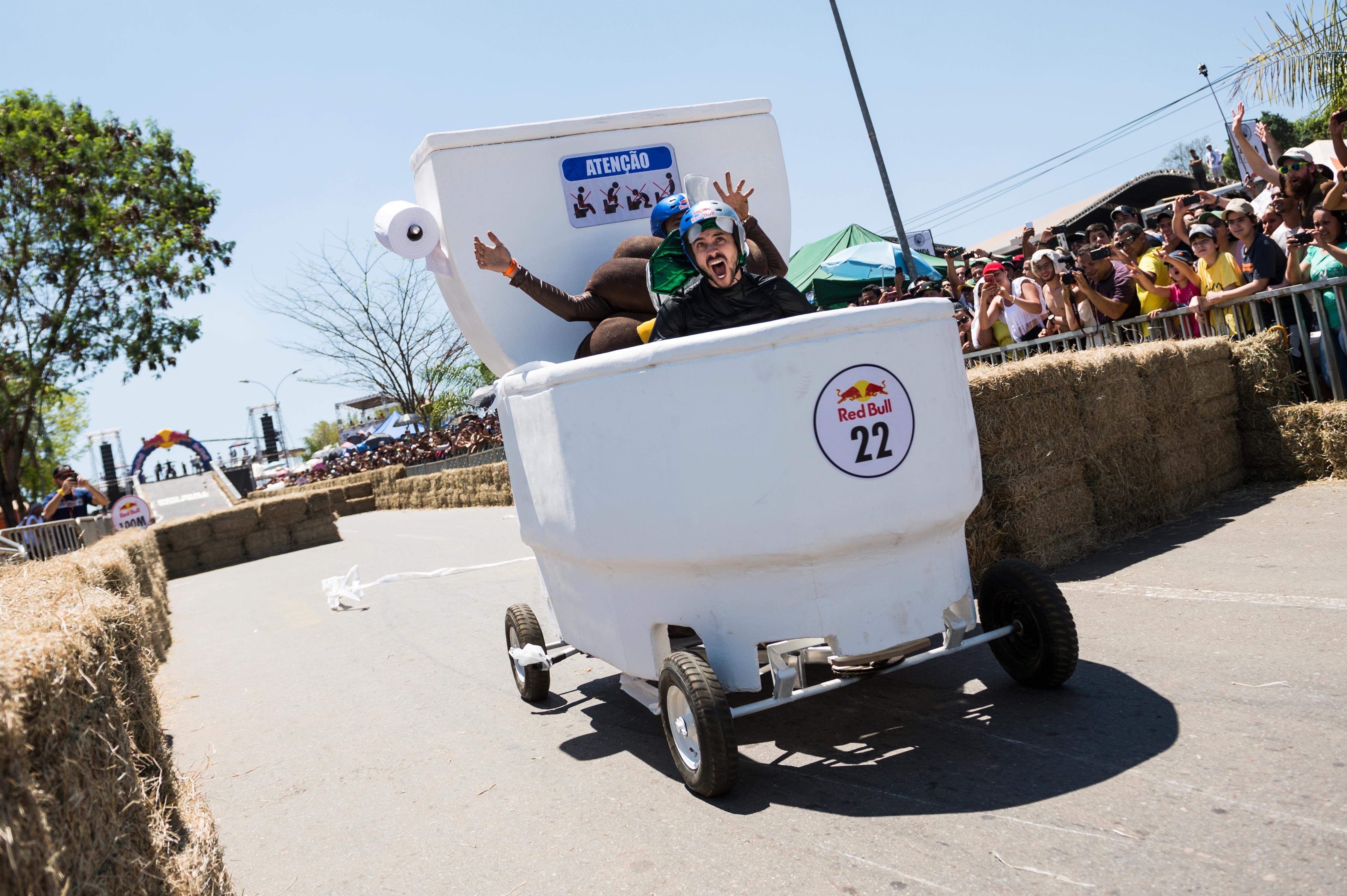 Ein Red Bull Seifenkistenrennen ist mit viel Geschwindigkeit, Ungewissheit, Sprüngen und oft auch Stürzen verbunden. All dies ist natürlich anstrengend für den Organismus, der manchmal ziemlich schlecht auf Stress reagiert. Vor allem im Darmbereich. Wir gratulieren daher den sehr pragmatischen Brasilianern des Team Sanitario im Jahr 2015.