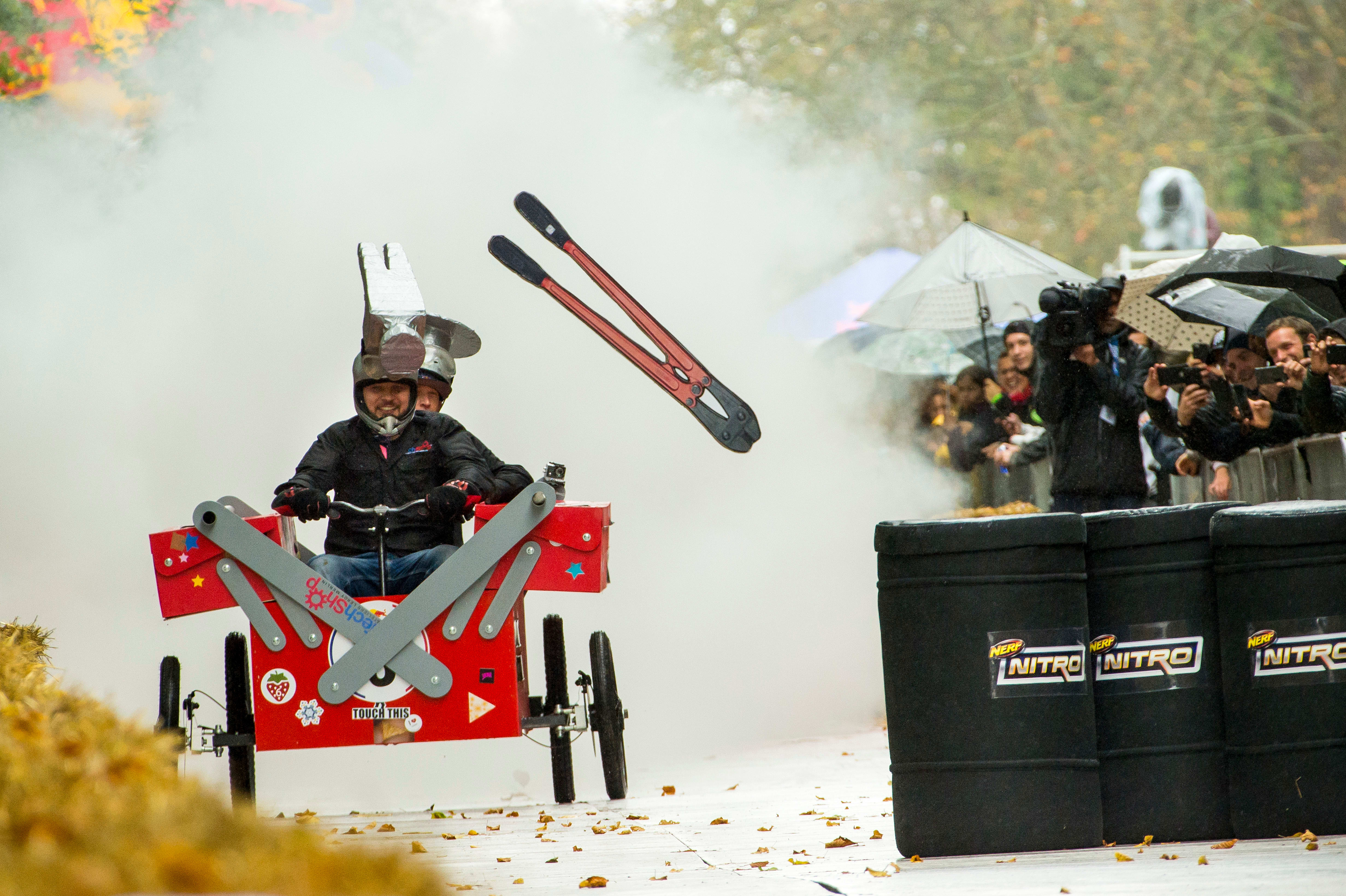 Die Bestausgestattete, aber auch die Visionärste. Denn wir dürfen nicht vergessen, dass dieser riesige Werkzeugkasten 2017 auf der Saint-Could-Strecke schwer abgestürzt ist (siehe bei 0:55 im Video unten). Der Vorteil? Die Seifenkiste konnte direkt vor Ort repariert werden.