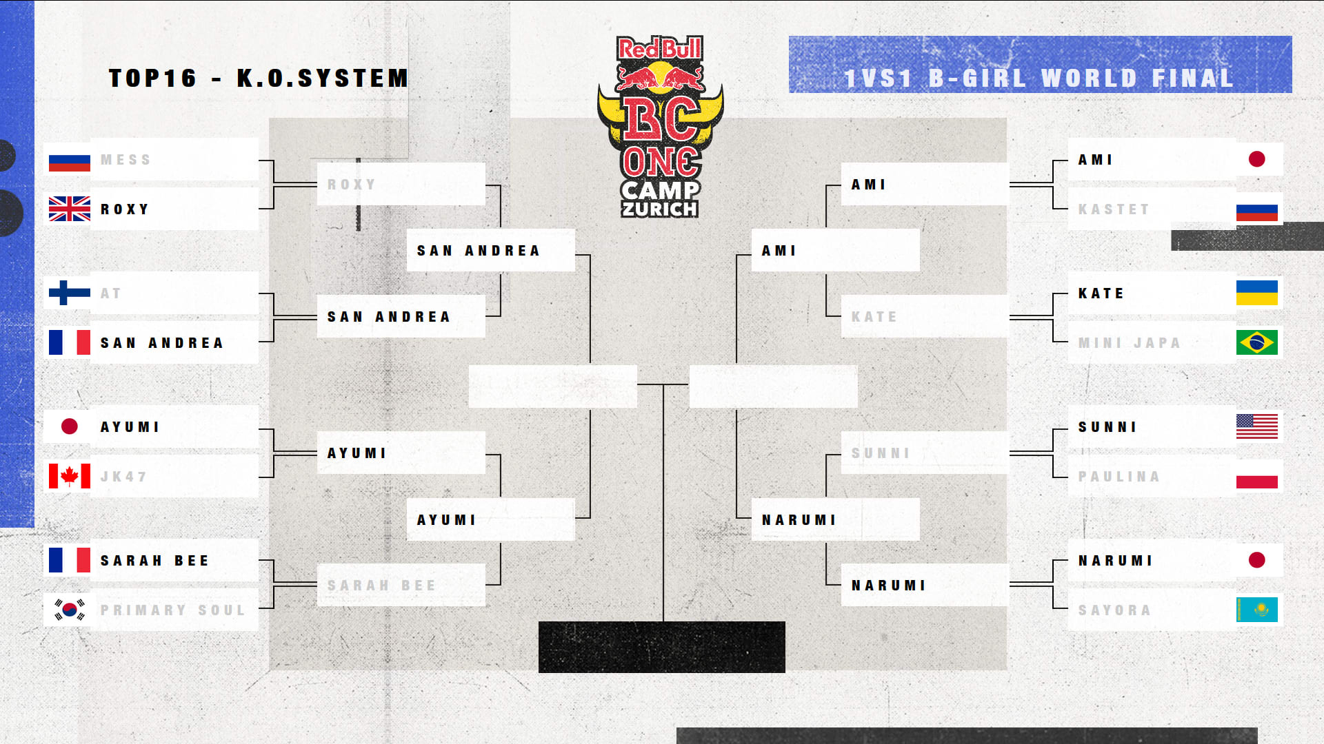 Und wer kriegt Platz #16 bei den Jungs? Wer sich den prestigeträchtigen letzten Platz im B-Boy Contest ergattern will, muss den nationalen BC One Cypher in eigenen Land bestreiten und sich dann im Last Chance Cypher gegen ca. 30 andere nationale Gewinner aus aller Welt beweisen. Nachdem der Last Chance Cypher den letzten Finalteilnehmer ins Weltfinale katapultiert hat, werden die Begegnungen ausgelost. Die 16 B-Boys treffen im K.O.-System aufeinander.