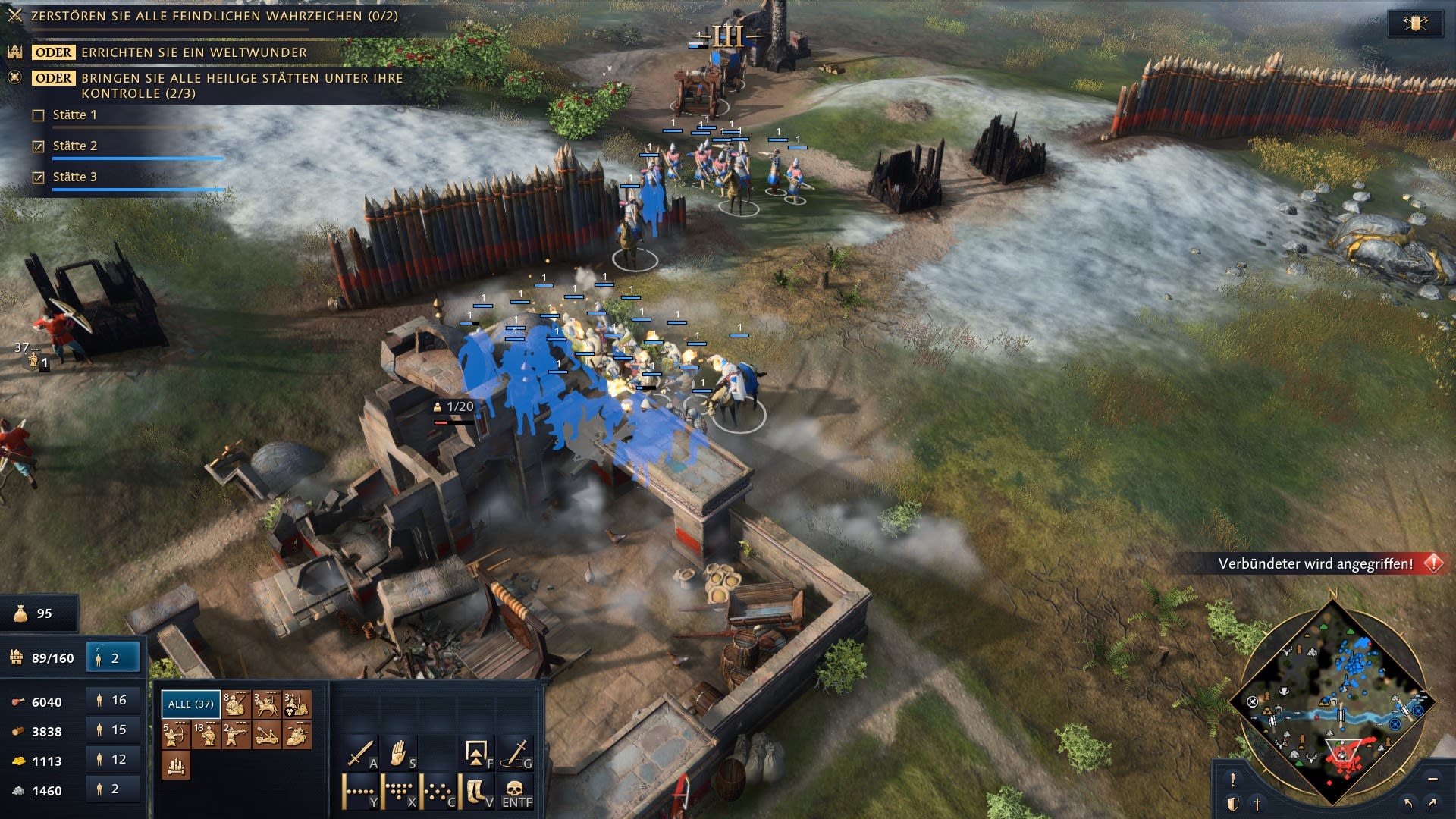 Screenshot aus Age of Empires 4 zeigt unsere Armee beim Angriff auf eine feindliche Basis.