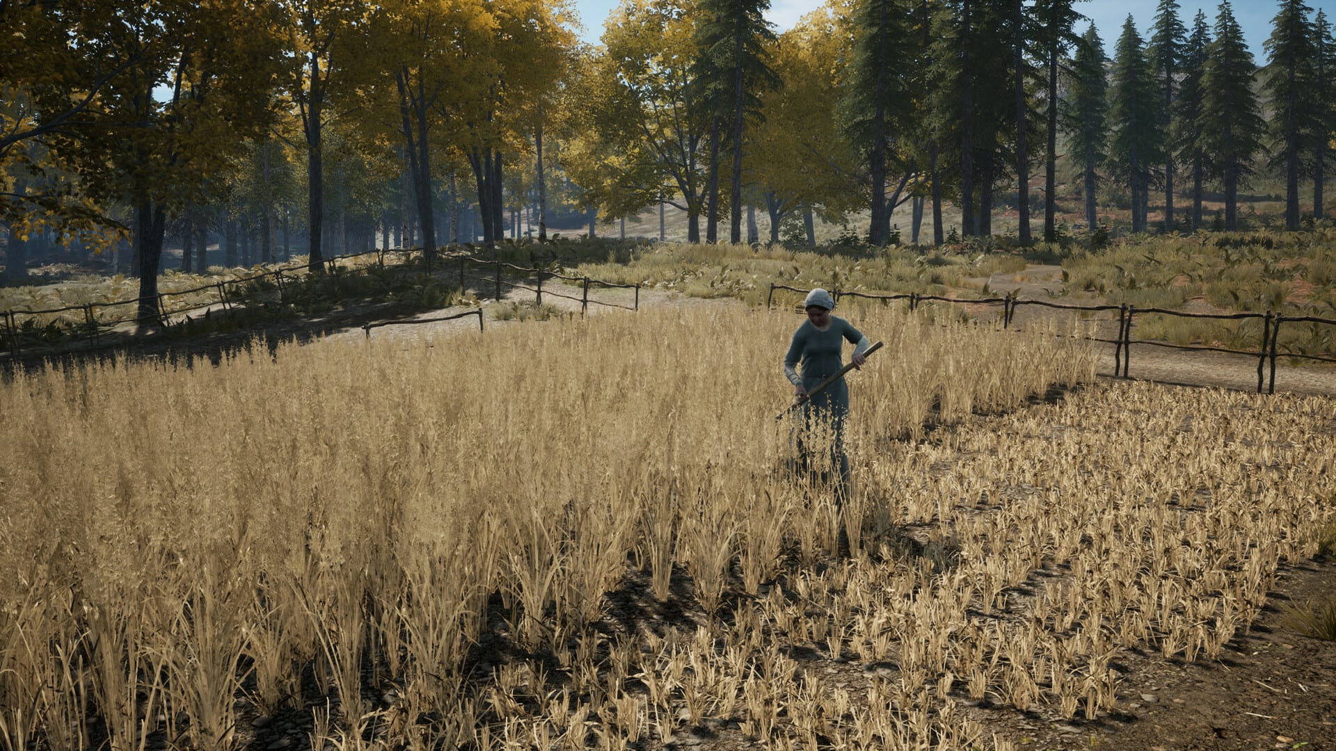 Screenshot aus Medieval Dynasty zeigt eine Bäuerin beim Bestellen des Feldes.