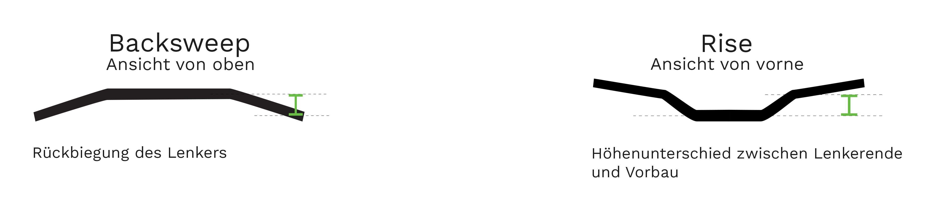Der Rise ist der Höhenunterschied zwischen dem Lenkerende und des Vorbau. Lenker mit Rise werden vor allem von abfahrtsorientierten Biker eingesetzt. Die Haltung ist damit etwas aufrechter und dadurch hat man einen vorausschauenden Blick ohne ständig gekrümmten Nacken.