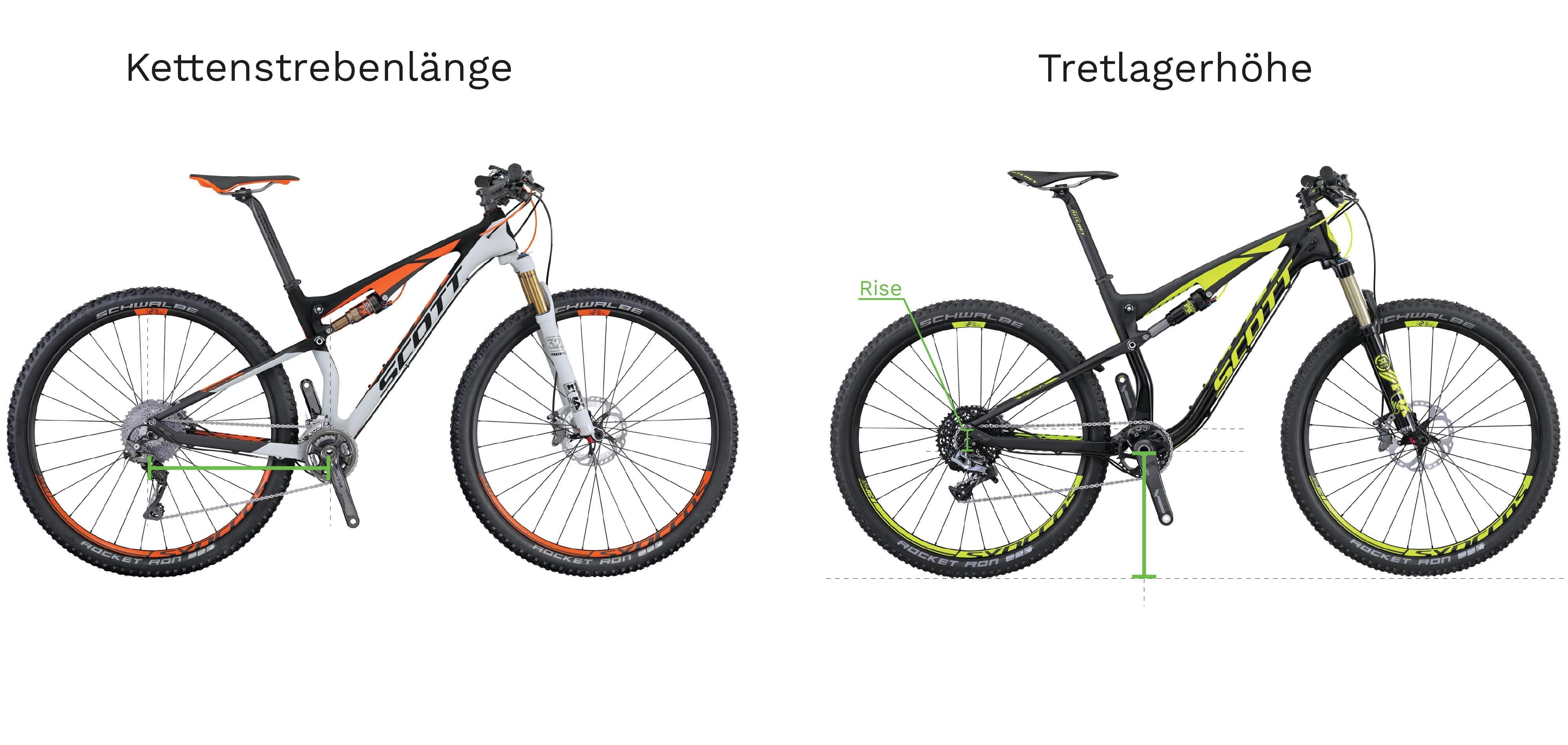 Ursprünglich wurde der Abstand vom Tretlager zum Boden gemessen. Durch die neuen Radgrössen und Reifen wird dieser heute in der Regel durch die Differenz zwischen Tretlager und Radachse angegeben – bei höherer Radachse als Rise und bei tieferer als Drop. Abfahrtsorientierte Bikes kommen mit einem Drop daher, welcher einen tieferen Schwerpunkt des Bikes nach sich zieht und somit eine höhere Stabilität und Laufruhe aufweisen. Ein Rise macht das Bike agiler und natürlich besteht weniger die Gefahr mit der Pedale am Boden anzustossen.