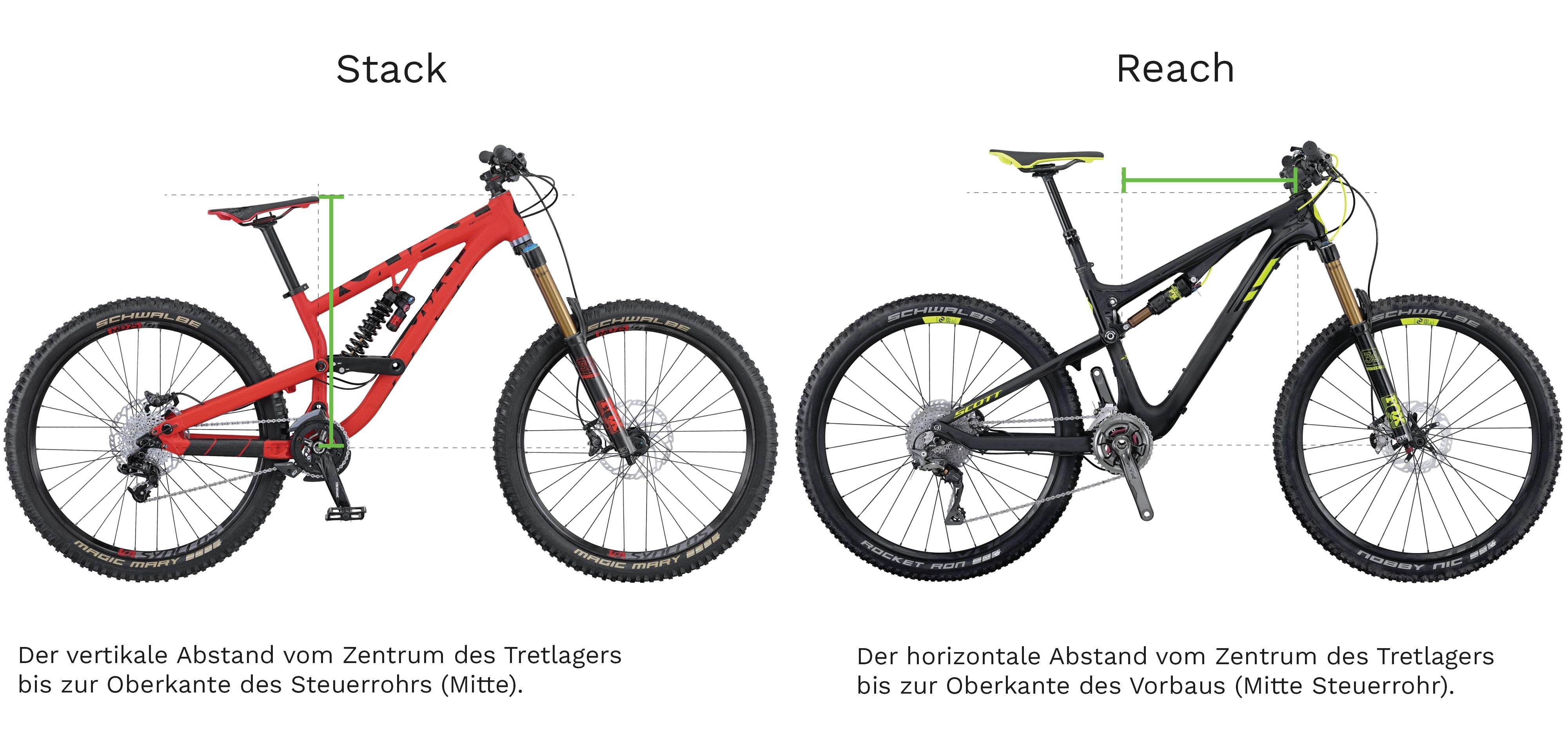 Ein längerer Stack bedeutet eine aufrechtere und somit entspanntere Haltung. Das Vorderrad hebt jedoch leichter ab. Ein kürzerer Stack bringt durch die gebeugtere und sportlichere Haltung mehr Druck auf das Vorderrand. Bei der Bergfahrt erleichtert dir eine aufrechte Haltung die Atmung, jedoch ist bei der sportlich gebeugten Haltung das „runter treten“ ergonomischer.