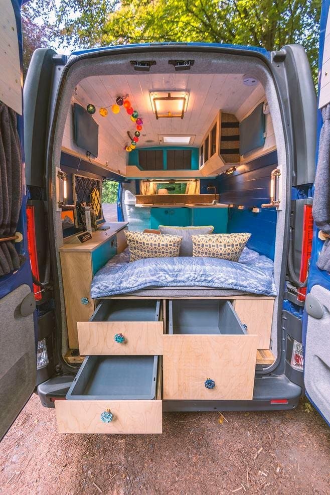 Bei manchen Dingen kannst du allerdings sehr wohl auf billige Materialien zählen. „Eines der besten Dinge, die wir bei unserem Umbau verwendeten, waren robuste Euro-Container, die wir zu Schubladen umfunktionierten. Sie sind günstig und man bekommt sie überall, das heißt man kann sie jederzeit ersetzen und austauschen. Die Tatsache, dass die Container aus Plastik bestehen, bedeutet, das sie super einfach zu reinigen sind. Und du wirst froh sein darüber, wenn du einmal mit dreckigen Sachen zum Camper kommst und danach nicht gleich den ganzen Holzboden abschleifen, sondern nur die Kunststoff-Container putzen musst. Außerdem sind sie extrem vielseitig. Du kannst sie ganz easy herausnehmen und deinen Wetsuit darin auswaschen - oder du nimmst sie als Duschwanne."