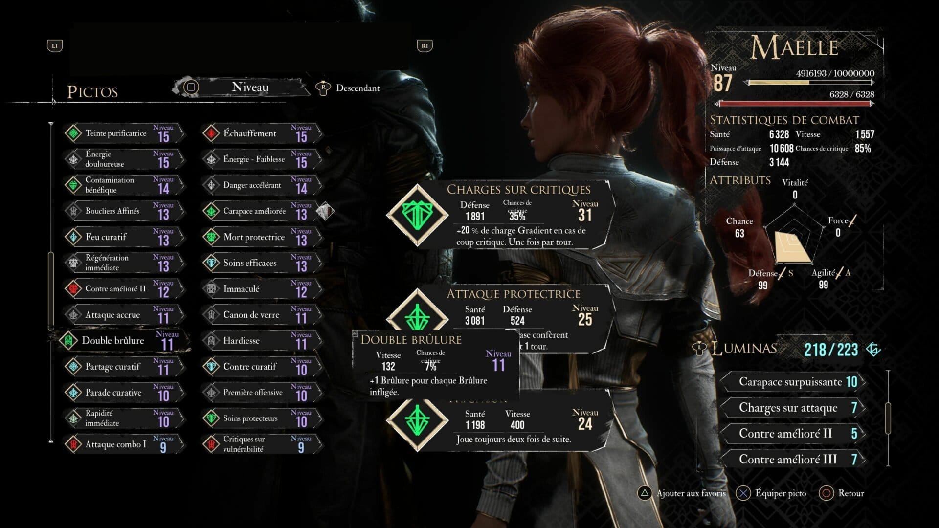 Pictos sind passive Fähigkeiten, die die Charaktere ausrüsten können. Sie ermöglichen es, als Erster anzugreifen, mehr Schaden bei Konterangriffen zu verursachen, nach einem Ausweichen AP zu gewinnen usw. Sie kosten je nach Qualität und Wirkung mehr oder weniger. Um ein Picto einem Charakter zuzuweisen, muss dieser genügend „Luminas“ haben, was einfach Punkte sind. Je weiter ihr im Spiel voranschreitet, desto mehr Pictos werdet ihr sammeln und habt so noch mehr Möglichkeiten, jeden Charakter anzupassen.
