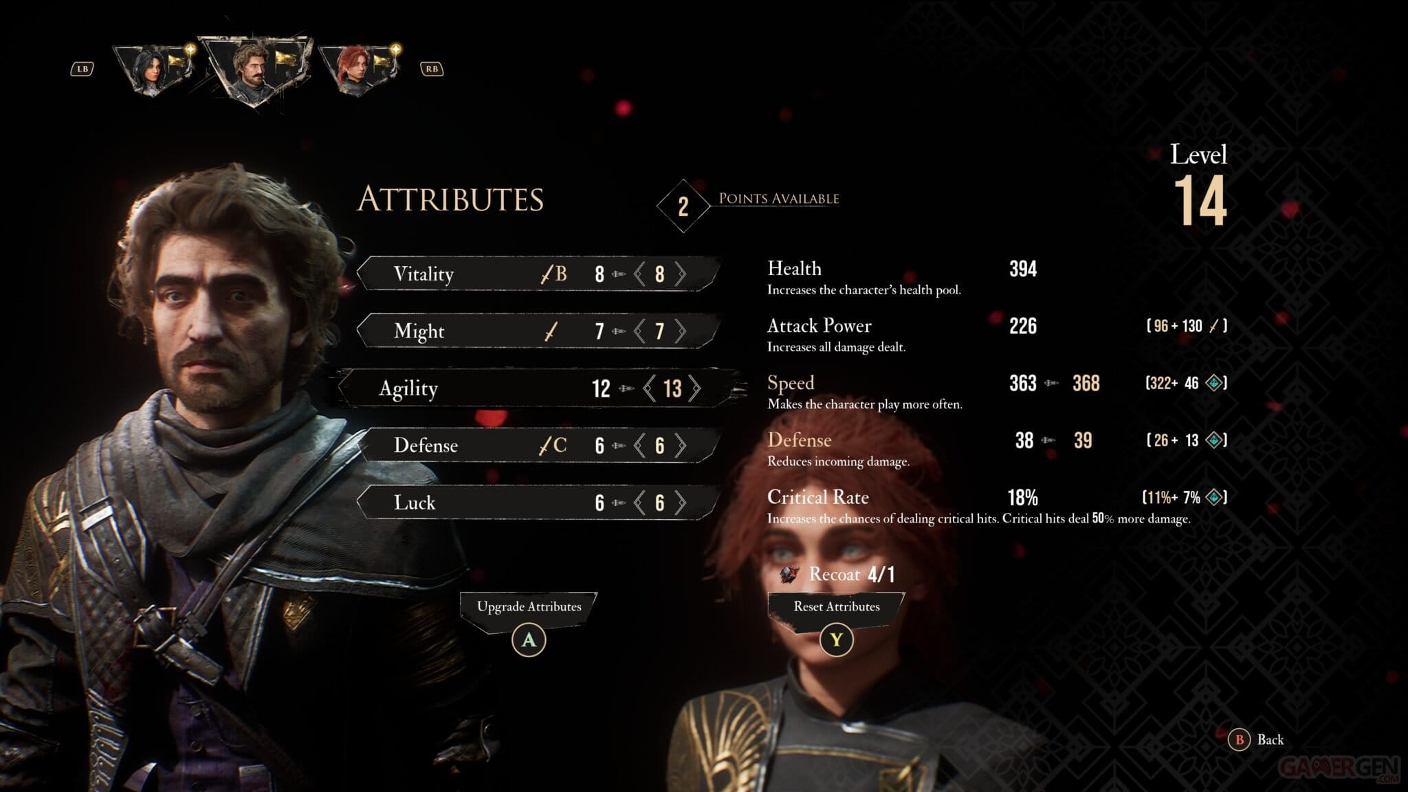 Jedes Mal, wenn ein Charakter ein Level aufsteigt, erhältst du 3 neue Attributspunkte, die du ihm zuweisen kannst, um seine Schadenswerte, Geschwindigkeit, Verteidigung, Lebenspunkte oder Glück (entspricht dem Prozentsatz für kritische Treffer) zu verbessern. Zusätzlich zu den Fähigkeiten kannst du also jeden Charakter in einen Tank, DPS, Heiler oder etwas anderes verwandeln… Der Spieler hat alle Freiheiten, die er braucht.