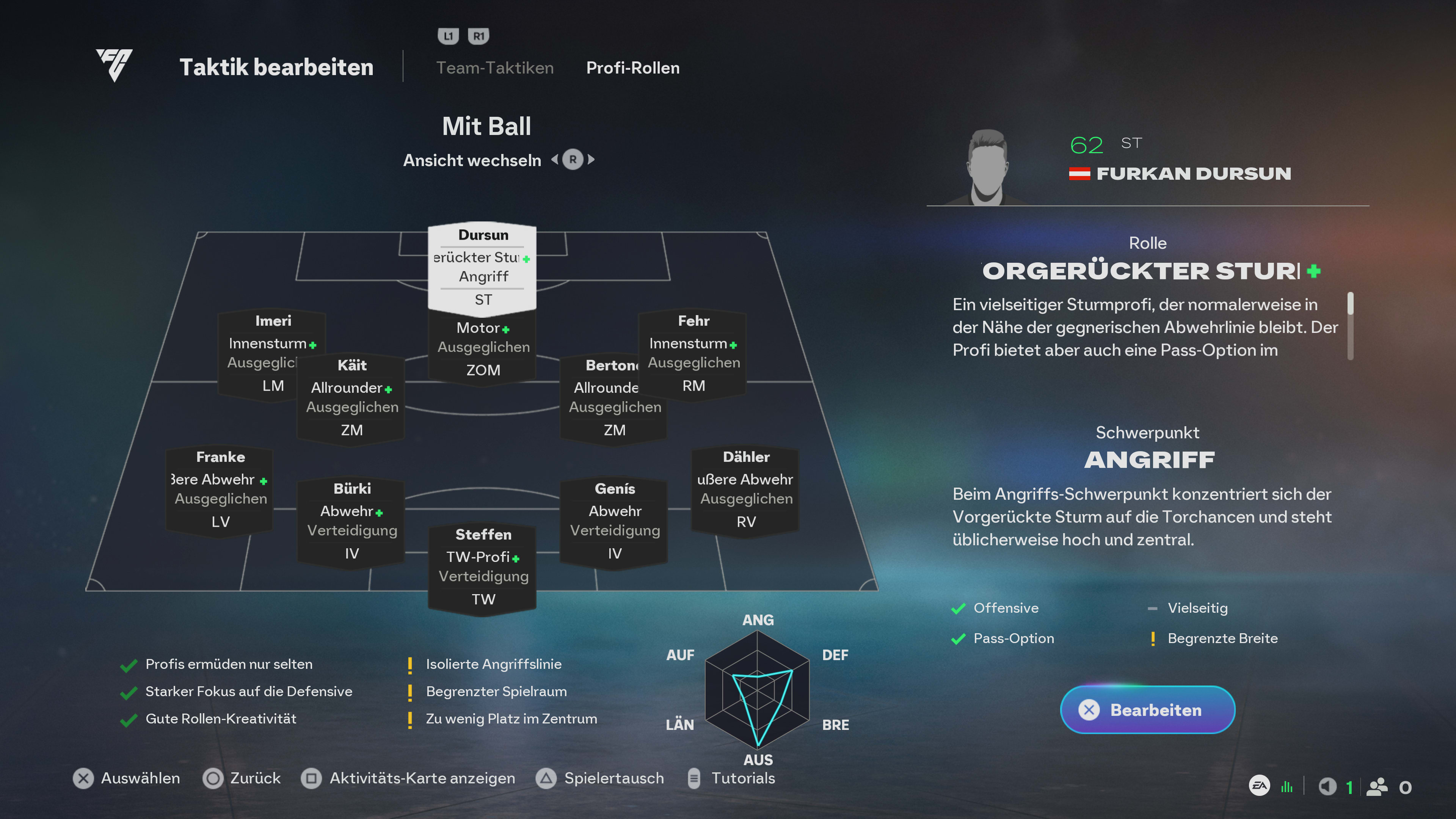 Die Außenmittelfeldspieler (Imeri und Fehr) als Innensturm sind essenziell, damit du in der Box mit drei bis vier Spielern auftauchst. Vorne ist Dursun als vorgerückter Sturmprofi und sorgt für die perfekten Laufwege, um die gegnerische Abwehrkette zu knacken.