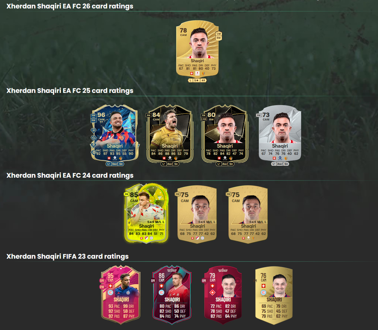 Xherdan Shaqiris Kartenhistorie in Ultimate Team zeigt ein klares Muster. Titel allein erhöhen keine Ratings. Spielzeit, Verantwortung und Output schon. Seine stärksten Karten kamen immer dann, wenn er auf dem Platz eine zentrale Rolle hatte. FC 26 schließt diesen Kreis. Seine aktuelle Basel-Karte hat ein solides Rating mit Leistungsbezug. Kein Bonus für die Vergangenheit, sondern eine Bewertung der Gegenwart.