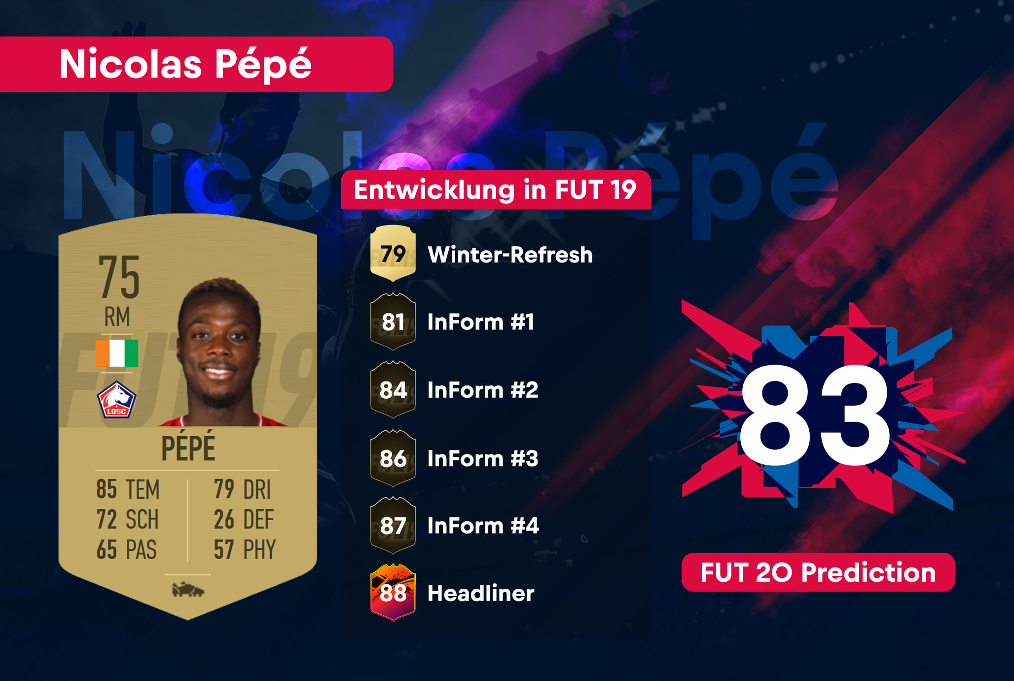 Dem Publisher blieb aber auch nichts anderes übrig. Schon viermal stand Pépé im FUT 19 Team der Woche, seine vierte InForm-Version hat ein Gesamtrating von 87. Auch eine Headliner-Karte des Linksfußes gibt es (88). Derzeit kostet sie rund 100.000 Münzen (PS4). Wenn der Torjäger aus der Ligue 1 In FIFA 20 keinen deutlich besseren Gesamtwert als zu Beginn von FIFA 19 hat, würde uns das schwer wundern. Unsere Prognose: 83!