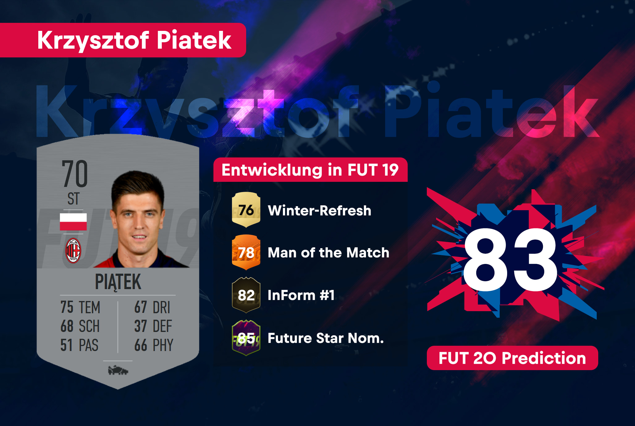 Beim FIFA 19 Winter-Refresh war Piatek der große Gewinner. Seine normale Karte, die vorher sogar nur eine Silber-Karte war (70), wurde auf Gold und 76 hochgestuft. Wie seine FIFA 20-Karte aussehen kann, zeigt seine InForm-Variante mit einem Gesamtrating von 82. Ungefähr diesen Wert wird wohl seine Karte im kommenden FIFA-Spiel haben. Unsere Prognose: 83 - das wäre im Vergleich zur Ursprungskarte in FIFA 19 ein Upgrade von + 13!
