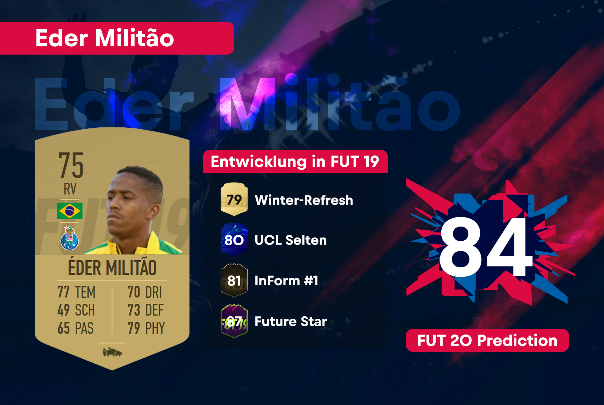 In FIFA 19 hatte Militao zu Saisonbeginn nur einen Kartenwert von 75, die bisher einzige InForm-Variante wurde mit 81 bewertet. Aber auch EA hat das Potential des Samba-Kickers erkannt. Militao bekam beim Winter-Refresh ein +4-Upgrade und ist einer der vom Publisher ausgewählten Future Stars, zu denen unter anderem auch RB Leipzig-Verteidiger Dayot Upamecano gehört. Die Future Stars-Karte von Militao kann sich mit einem Rating von 87 sehen lassen. Kostenpunkt aktuell: 292.000 Münzen (PS4). Dem Brasilianer blüht eine große Zukunft und schon in FIFA 20 wird seine normale Goldkarte einen enormen Werteboost bekommen. Unsere Prognose: 84!