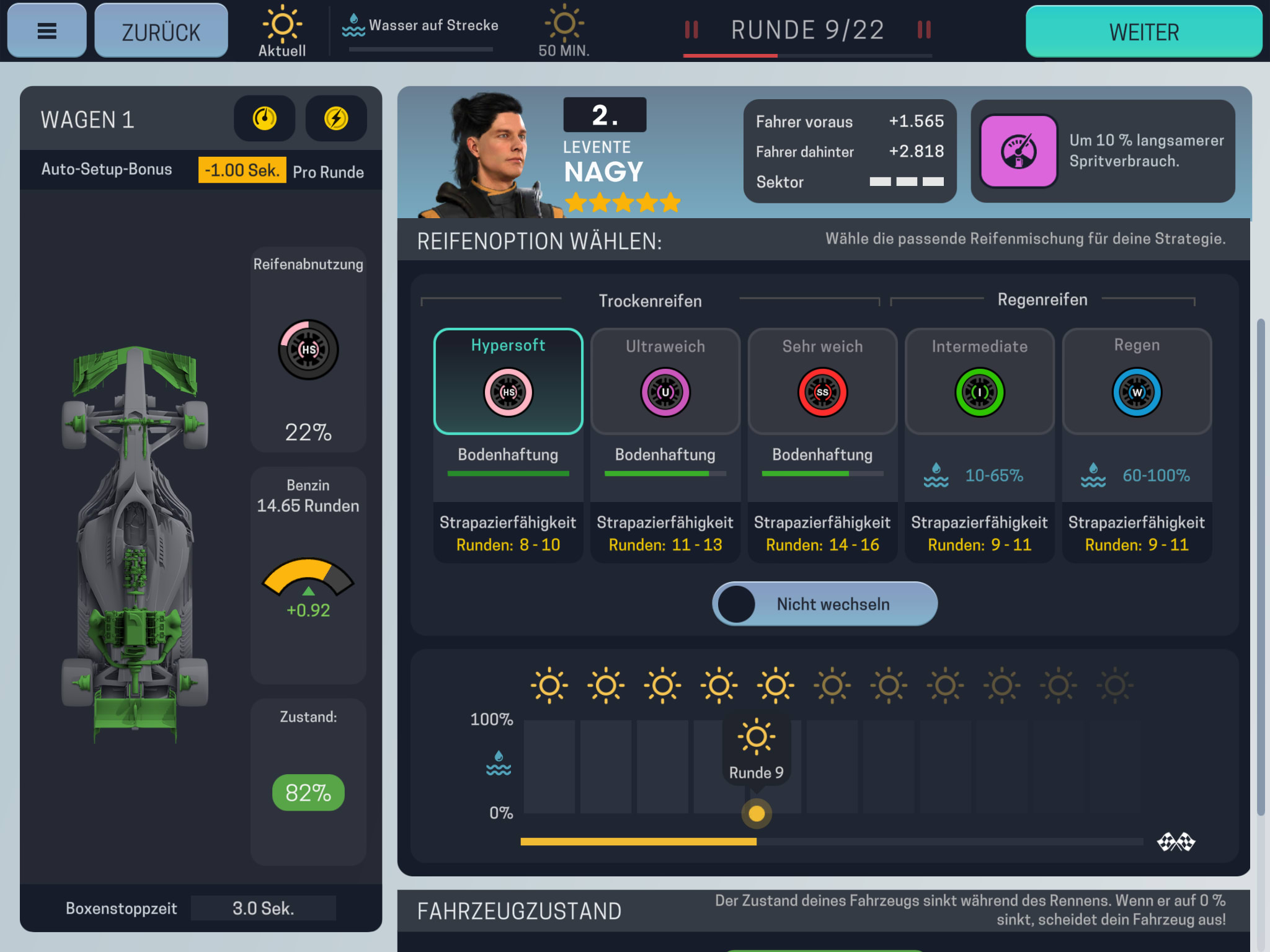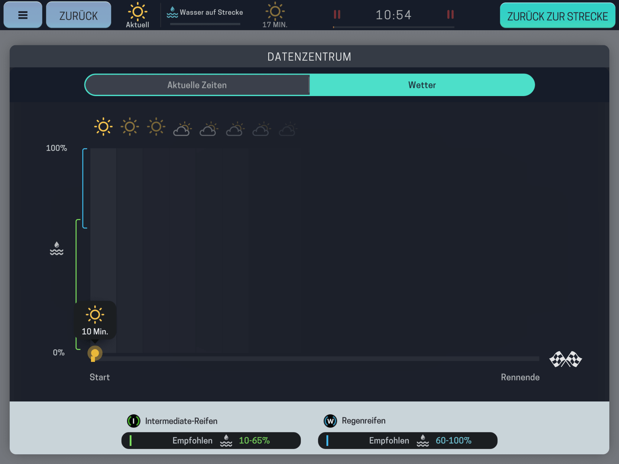 Habt das Wetterradar immer im Blick. Zieht in Kürze Regen auf, versucht eure regulären Boxenstopps so zu legen, dass ihr auch gleich die passenden Regenreifen aufziehen könnt. So spart ihr euch einen unplanmäßigen Stop und könnt an der in der Boxengasse stehenden Konkurrenz vorbeiziehen.
