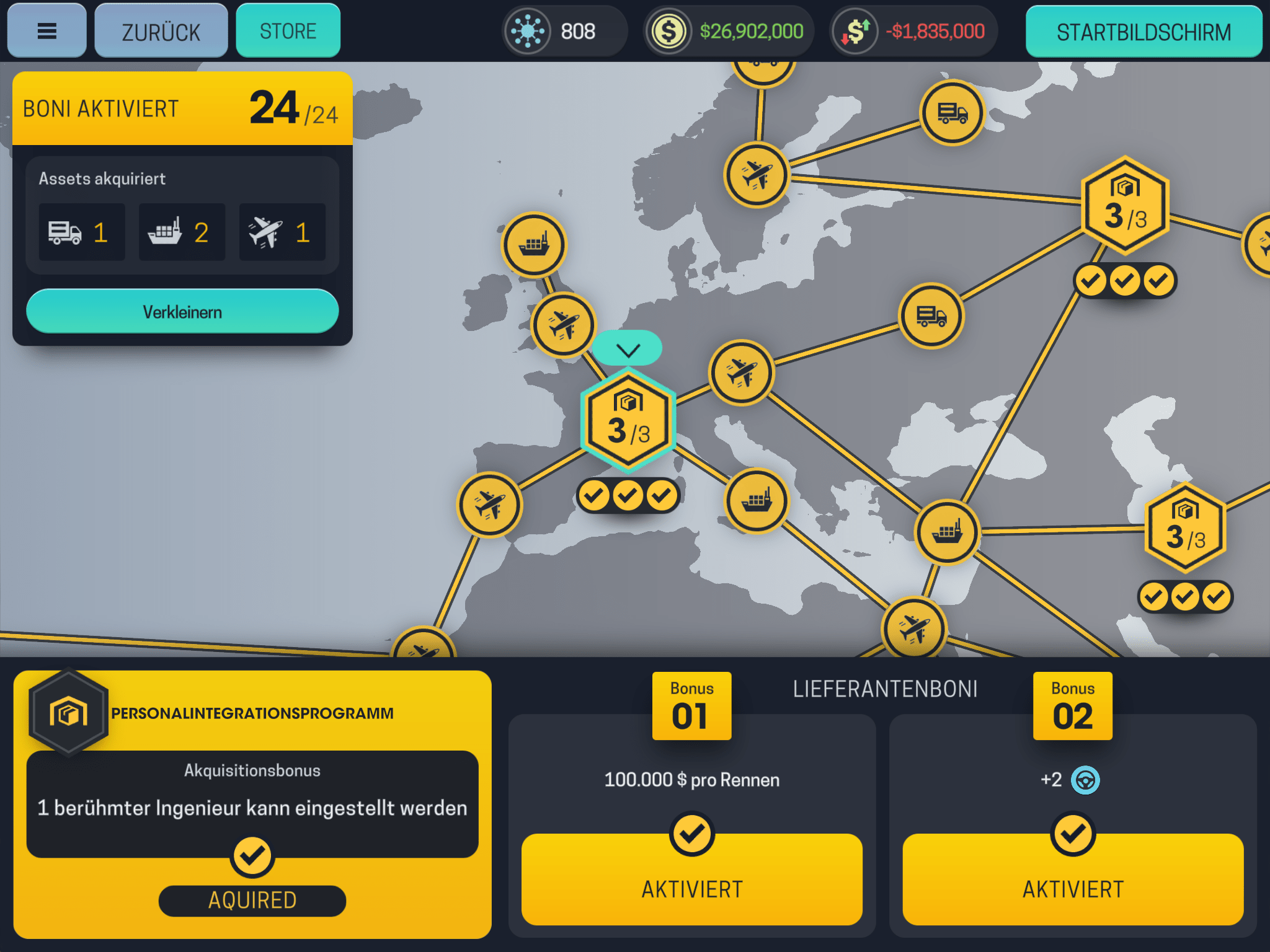 Auch das im dritten Teil neue Lieferantennetzwerk ist eine sinnvolle Sache. Durch dieses schaltet ihr Boni frei. Wählt diese mit Bedacht und beginnt den Ausbau an einer sinnvollen Stelle, um schnell interessante Boni an Knotenpunkten aktivieren zu können.