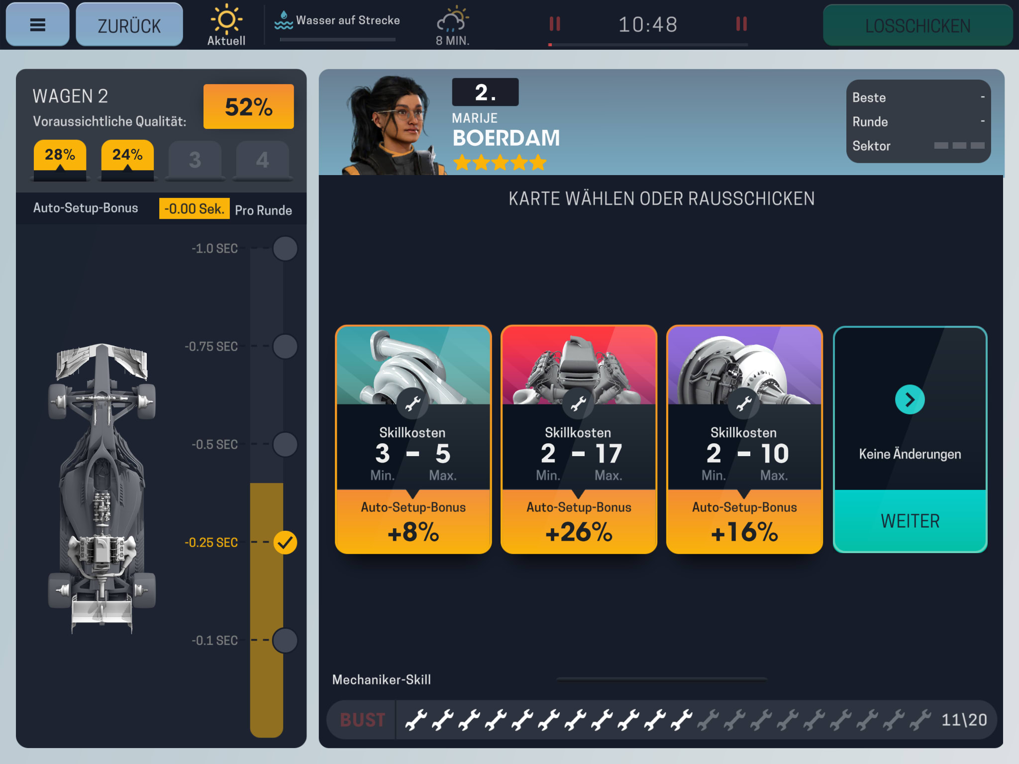 Vor dem Rennen steht das Qualifying, um die Startpositionen der Fahrer zu bestimmen. Bevor es auf die Piste geht, könnt ihr eure Renn-Ingenieure (die möglichst viele Skills haben sollten) ans Werk lassen. Sie verbessern die beiden Rennwagen eurer Fahrer bis zu viermal. Allerdings ähnelt dies einem Glücksspiel, da ihr nicht wisst, wie viele Mechaniker-Skills die einzelnen Verbesserungen genau kosten.