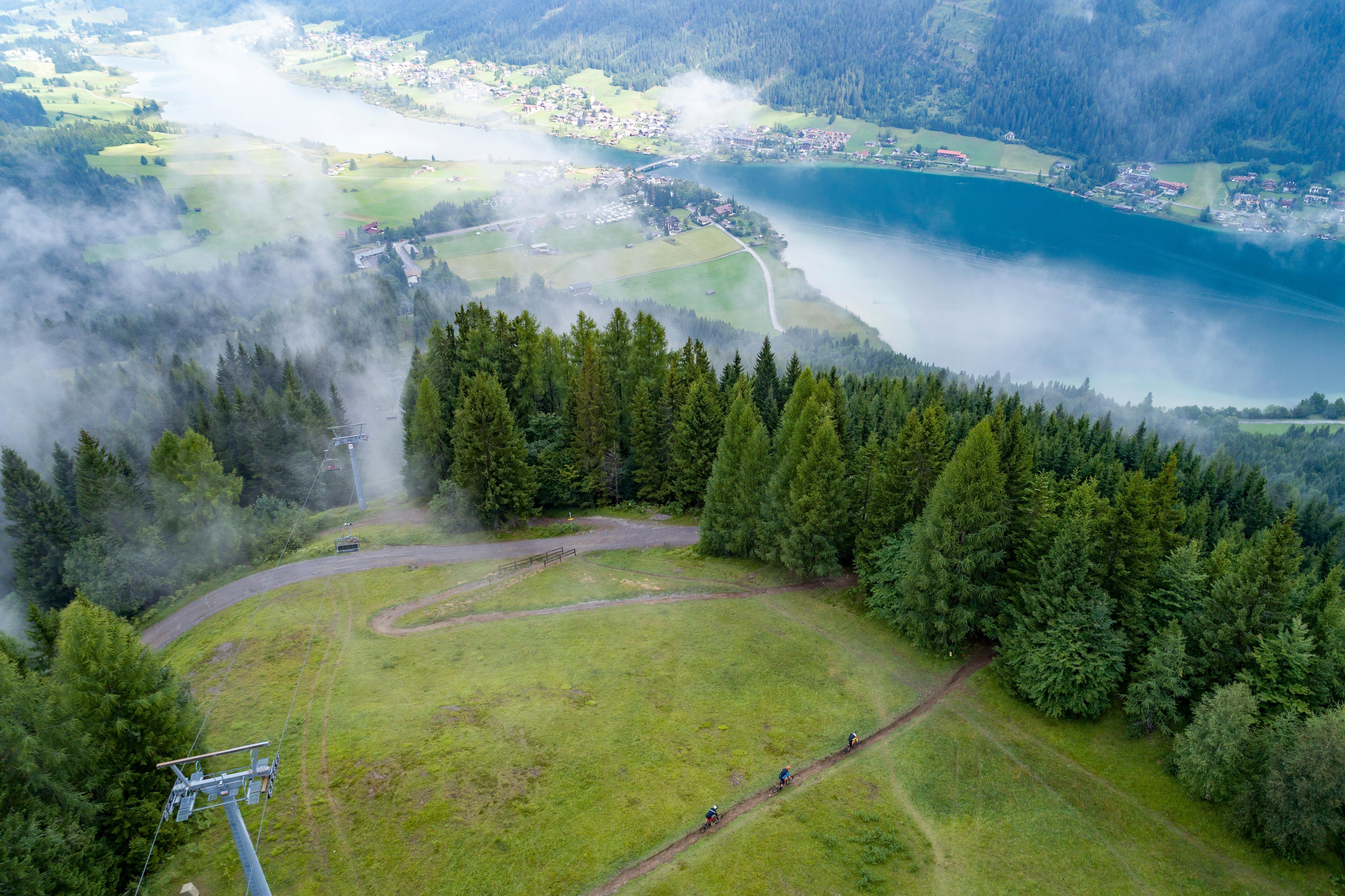 Außerdem genießt du dort ein atemberaubendes Berg-Panorama und einen fabelhaften Ausblick auf den Weissensee. Wenn du die Route 5 nimmst, kommst du mit dem Bike an den Start, du kannst aber auch die Seilbahn nehmen.
