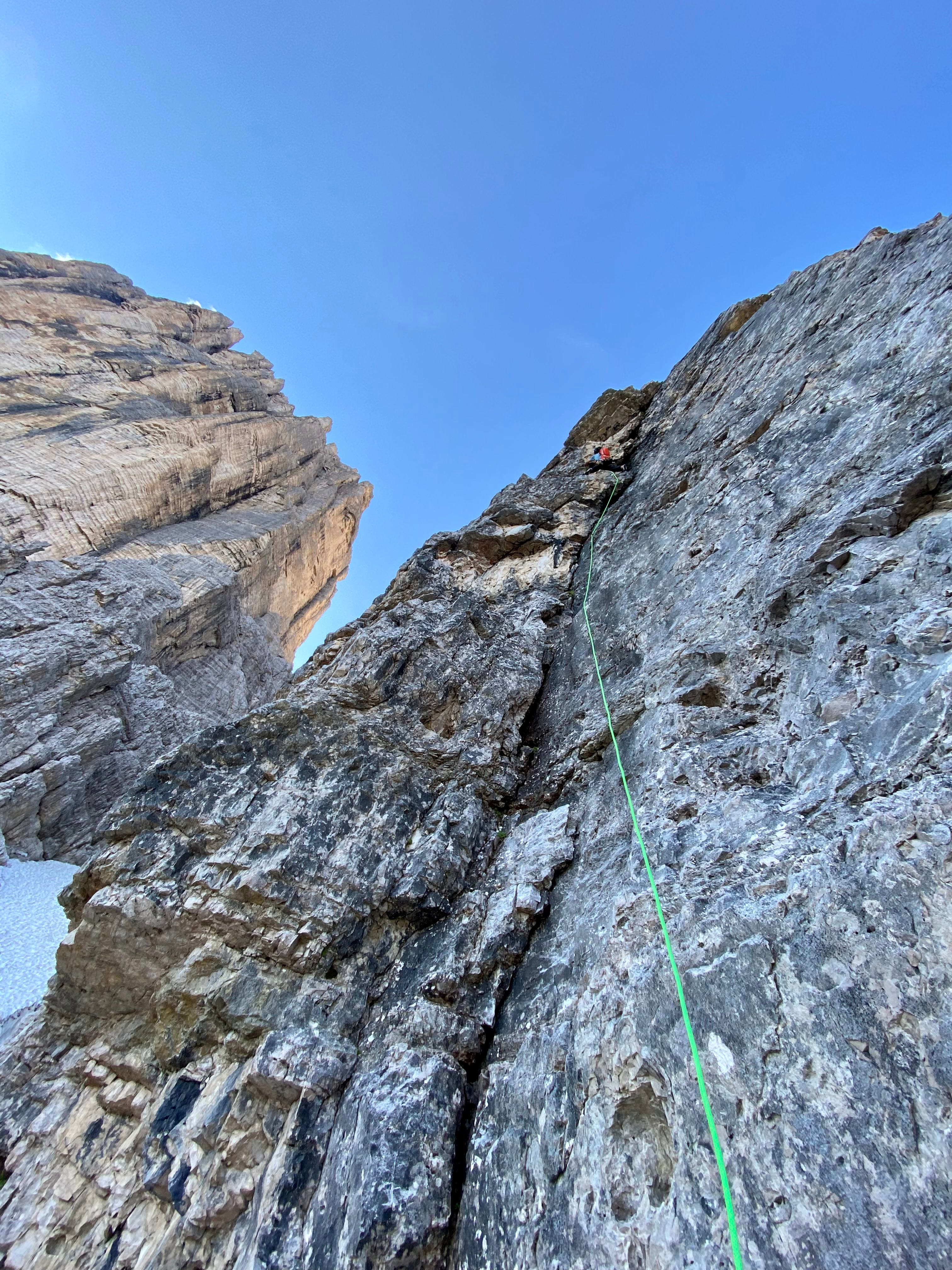 Als wir nach drei Routen zum zweiten Mal in Richtung Grosse Zinne loskletterten, wurde mir klar, dass wir es schaffen können. Zuvor hatten wir die Comici in der Grossen Zinne geklettert, gerieten dabei in einen Stau und mussten etwa fünf Seilschaften überholen. Dabei hatten wir ziemlich viel wertvolle Zeit verloren. Im Nachhinein müssen wir uns bei diesen Leuten bedanken, dass sie uns so grosszügig durchgelassen haben. Als wir dann nur noch die kleine Zinne vor uns hatten, wussten wir beide, dass wir es schaffen würden.