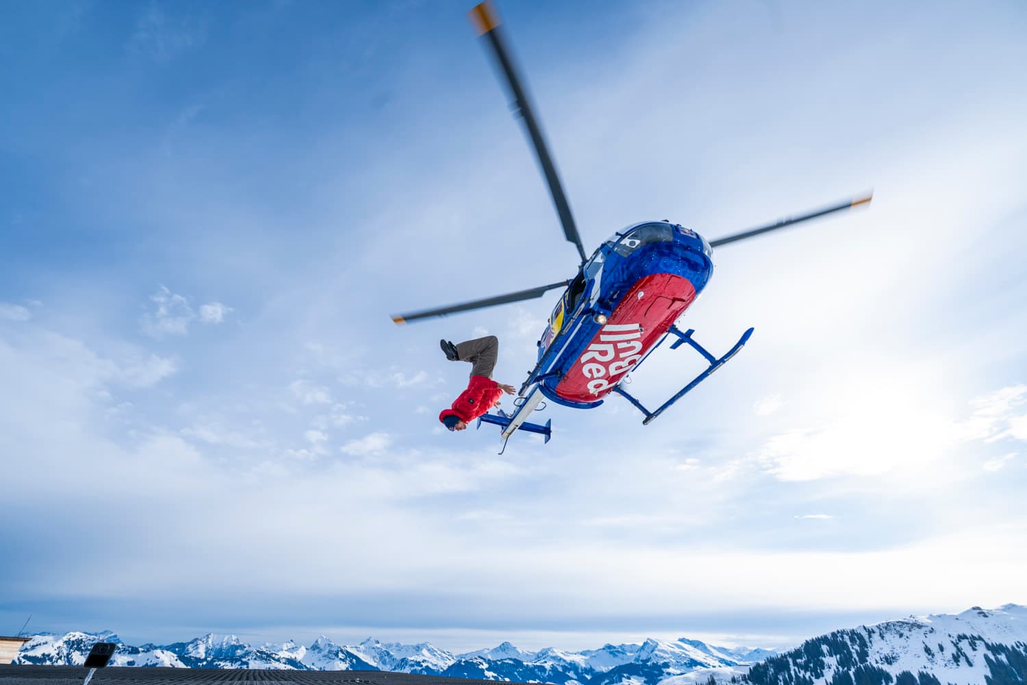 Aber das alleine wäre ja noch zu easy going – darum hat er noch zwei besonderen Ideen aus dem Hut gezaubert. Warum "nur" aus dem Starthaus herausstarten – wenn man Flying-Bulls-Piloten Mirko Flaim anrufen kann, der einem mit dem Hubschrauber BO 105 Flügel verleiht und einen actionfilmreifen "up in the air" Einstieg über dem Starthaus ermöglicht.