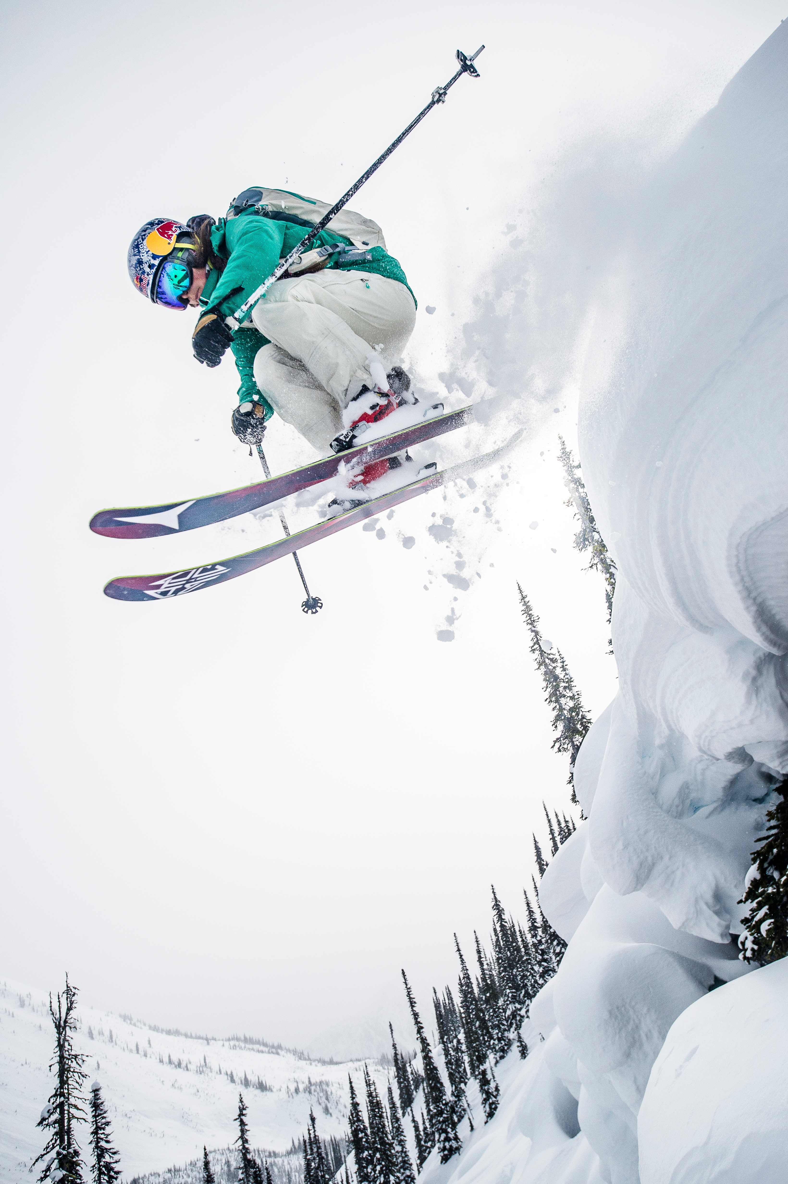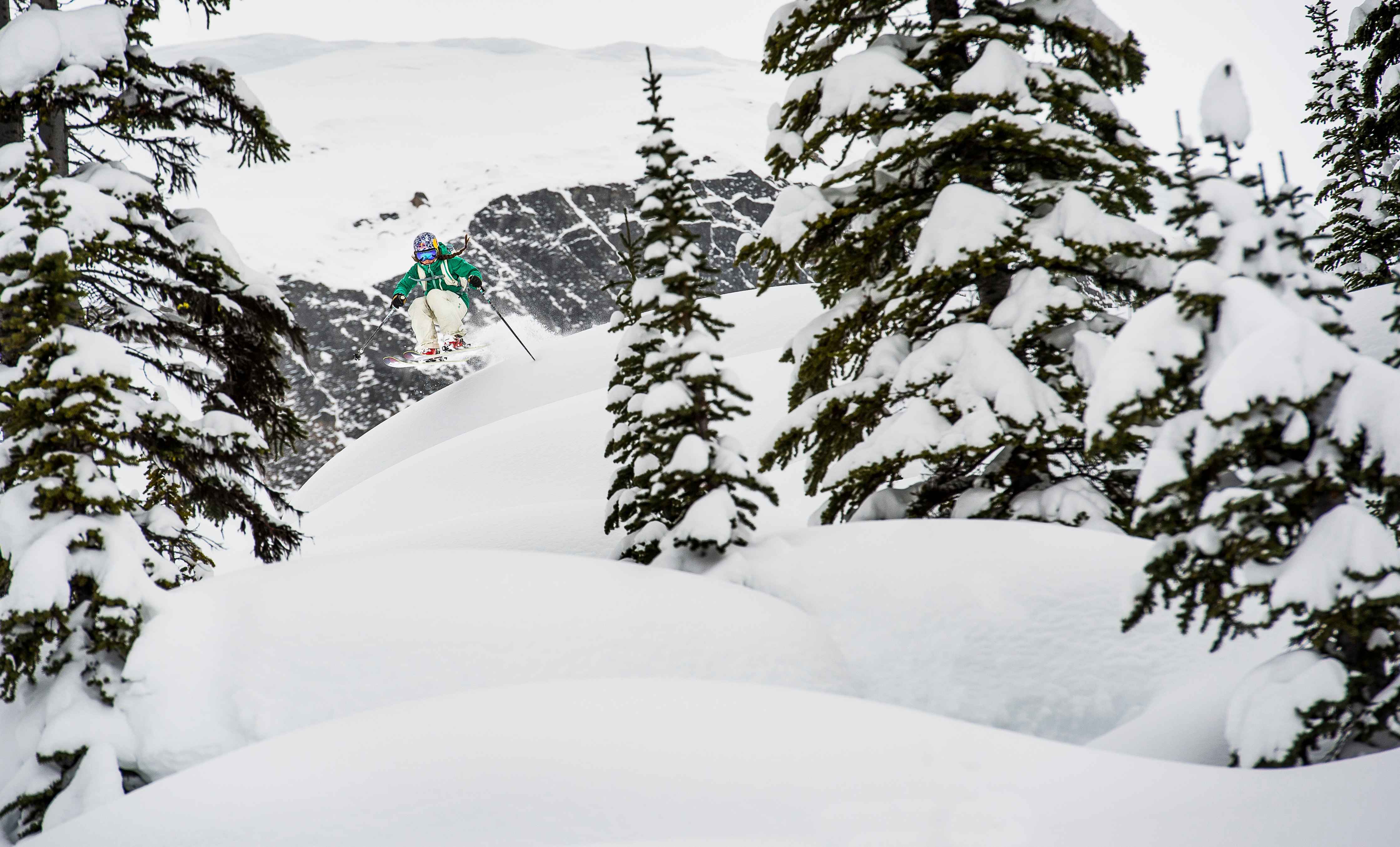 Michelle Parker segelt über einen Pillow im Backcountry von Kanada