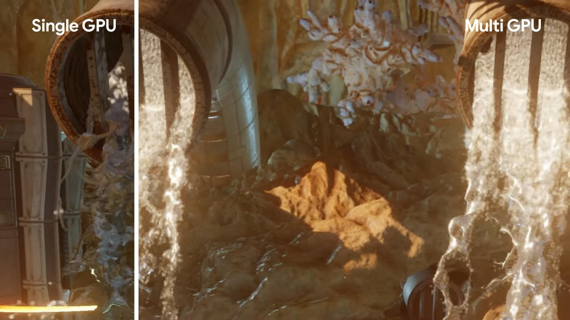 Vor allem die Darstellung von Grafikeffekten für Wasser, Lava und anderen Flüssigkeiten soll von mehreren Grafik-Prozessoren profitieren. In der gezeigten Demo waren die Unterschiede zwischen einer GPU und mehreren bereits deutlich sichtbar. Auch die Physikberechnung soll in die Cloud ausgelagert werden können, was in Games für eine vollständig zerstörbare Umgebung sorgen soll.