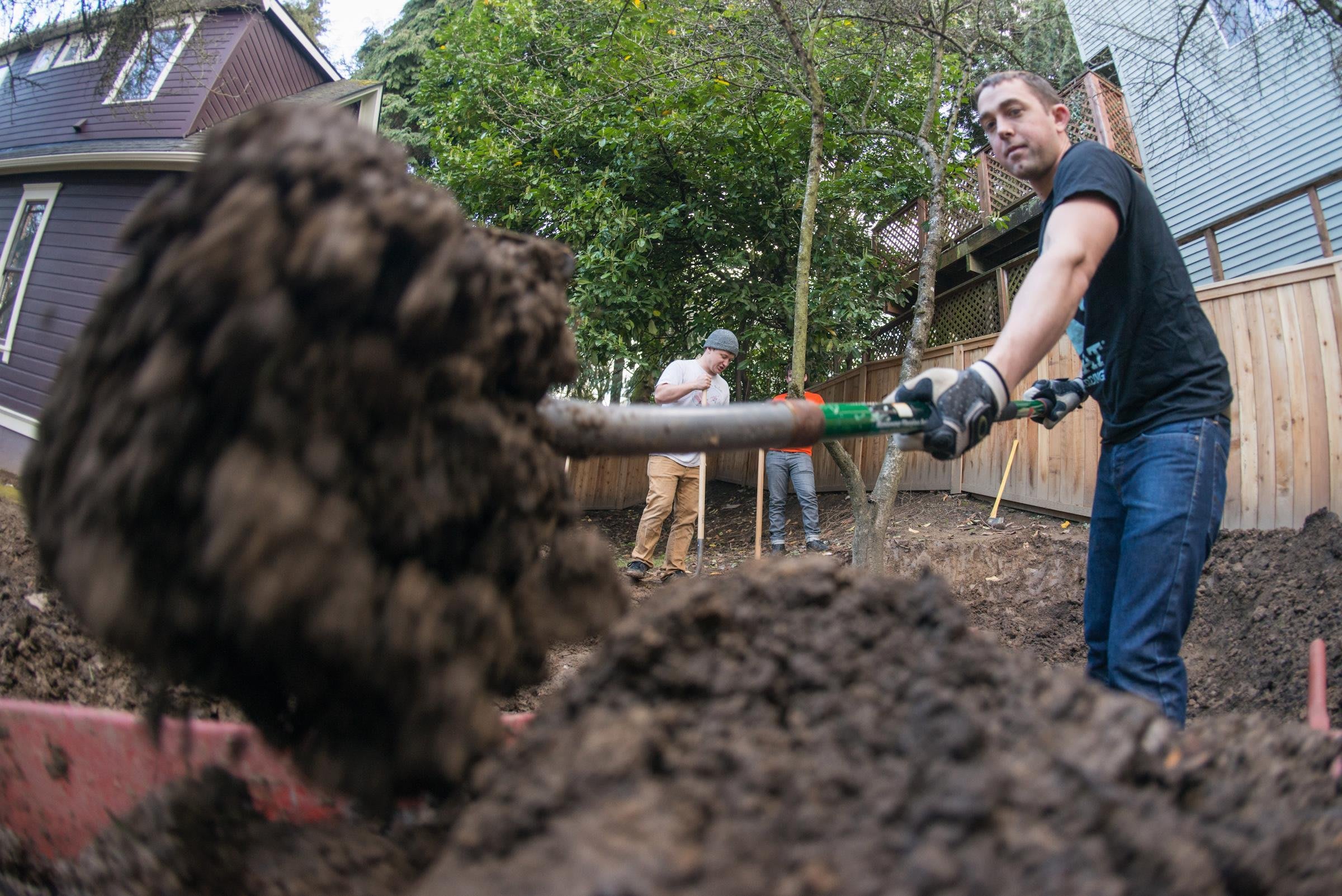 De la terre : Pas besoin d'en apporter. Si vous avez assez d'espace pour un pump track, il y a une bonne chance que ce dont vous avez besoin se trouve juste sous vos pieds. Sur un terrain plat, dans beaucoup de cas on peut créer une piste de toutes pièces. Dans notre cas, il y avait une petite inclinaison, donc la plupart de la terre sur le haut de l'arrière-cour a pu être creusée pour aplatir le terrain, et aussi faire des bermes à l'arrière. Mais la terre doit bien tenir. Si le pump track est trop lisse, ça ne va pas marcher. Avec un sol trop ensablé, il va falloir penser à des alternatives.
