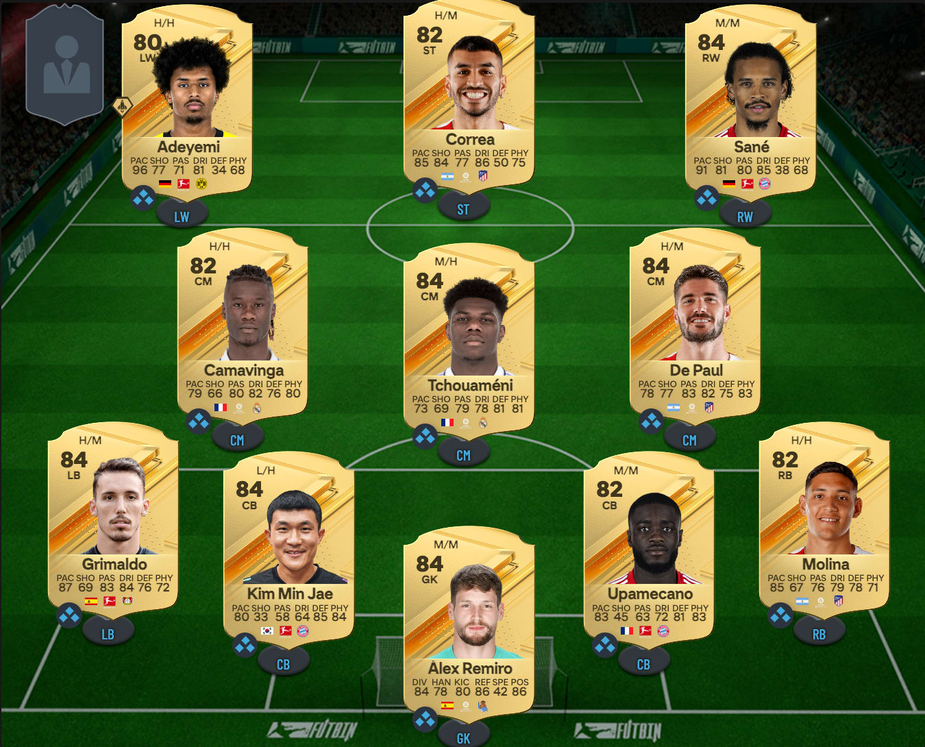Preuve en est avec ce milieu de terrain dans lequel se trouve deux Français que l’on n’a plus à présenter : Eduardo Camavinga et Aurélien Tchouameni. Les deux internationaux coûtent aujourd’hui à peine 12 000 crédits, et voient leurs qualités parfaitement complétées par Rodrigo De Paul. L’Argentin assure un bon équilibre à ce milieu de par des qualités offensives que les deux autres n’ont pas. Il est le plus à même de prêter main forte à la ligne d’attaque composée de… Leroy Sané, Angel Correa et Adeyemi.