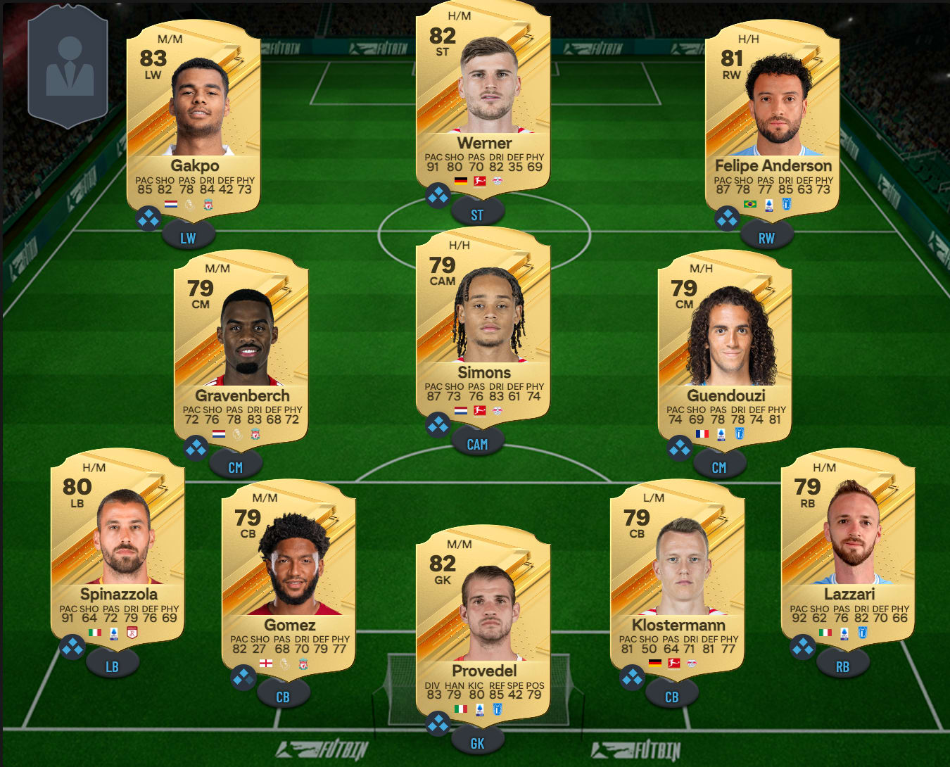 Si, à priori, cette équipe ne paie pas de mine, vous trouverez difficilement mieux pour ce budget. Du moins, à cette période de l’année. À commencer par Provedel, le gardien de la Lazio, qui du haut de son mètre 92 peut vous rendre de fiers services. Plébiscité par plusieurs streameurs reconnus, il permet aussi et surtout d’intégrer Felipe Anderson à l’effectif. Le Brésilien a une vitesse correcte, est agile et dispose d’un double 4 étoiles pour animer son aile. Mais ce qui en donne réellement, c’est le trio Klostermann-Xavi Simons-Werner.