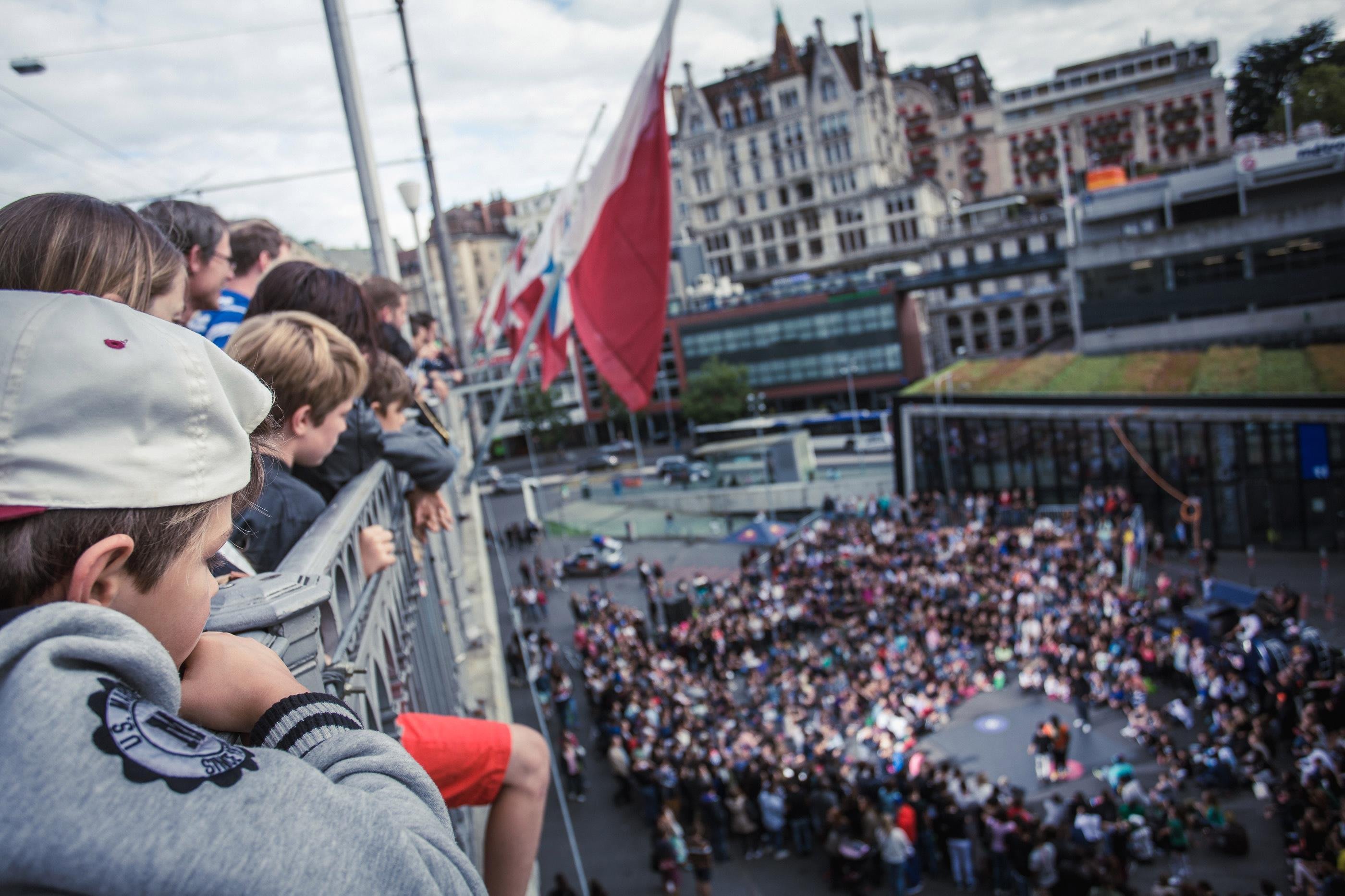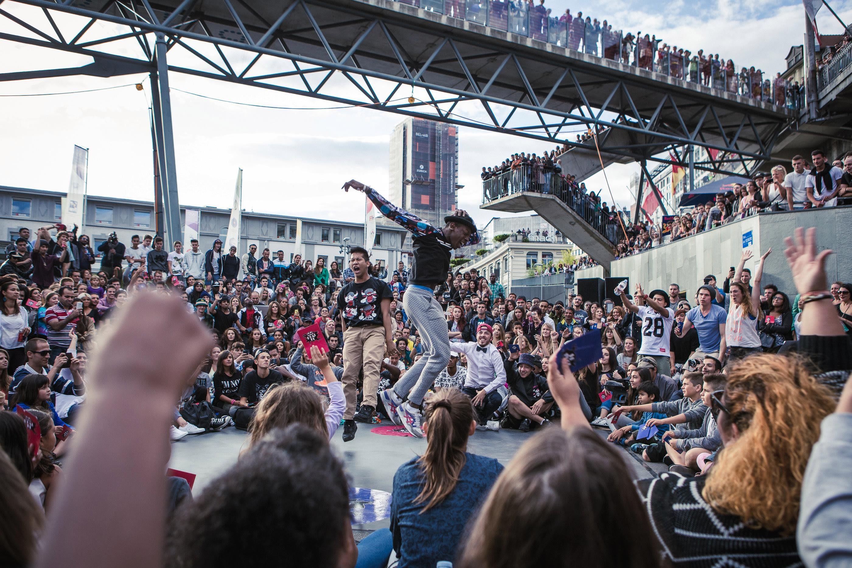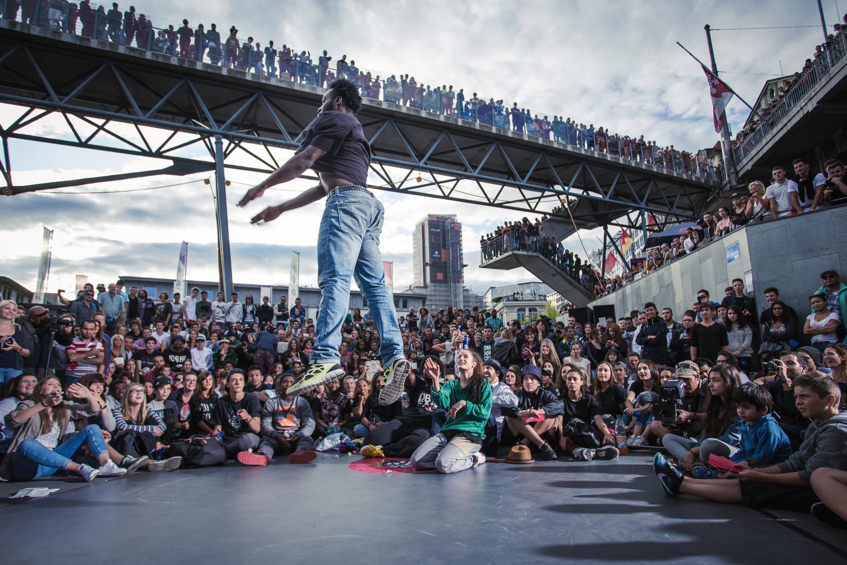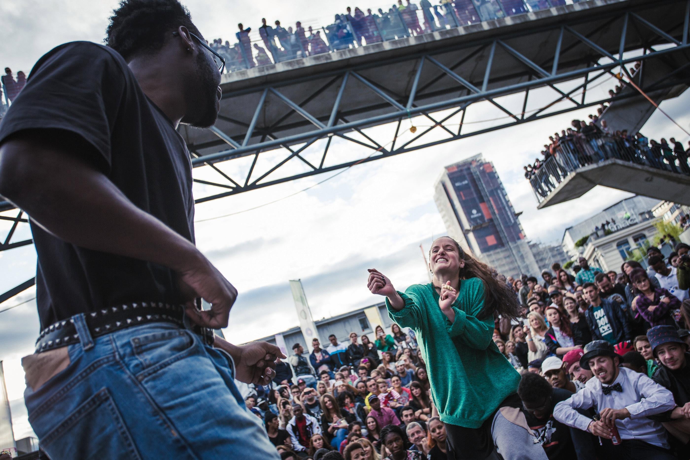 La Place de l’Europe et les ponts qui l’enjambent sont complétement bloqués en cette fin de samedi après-midi. Plus de 2000 spectateurs curieux assistent au rendez-vous de 16 danseurs chevronnés venus de toute la Suisse.