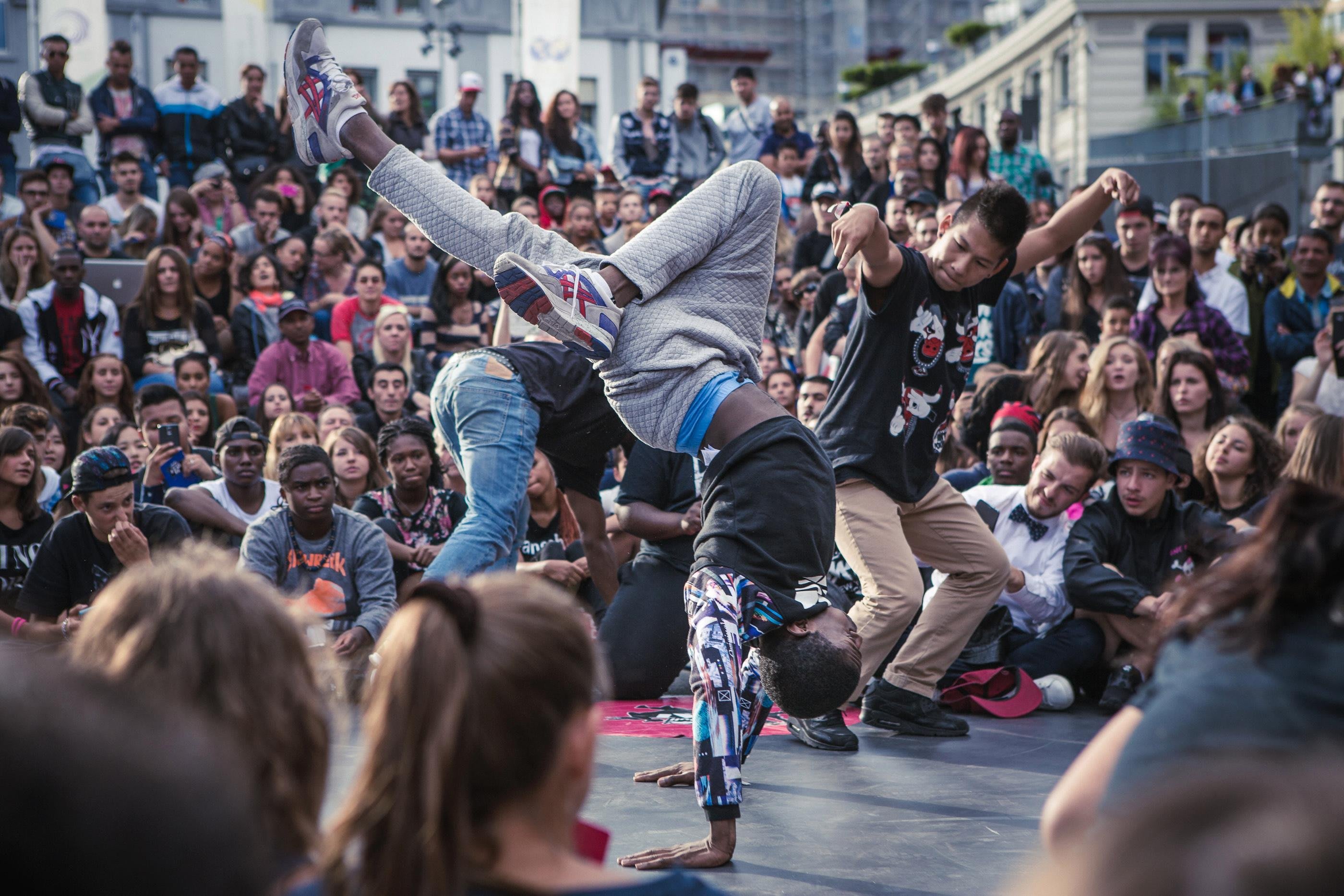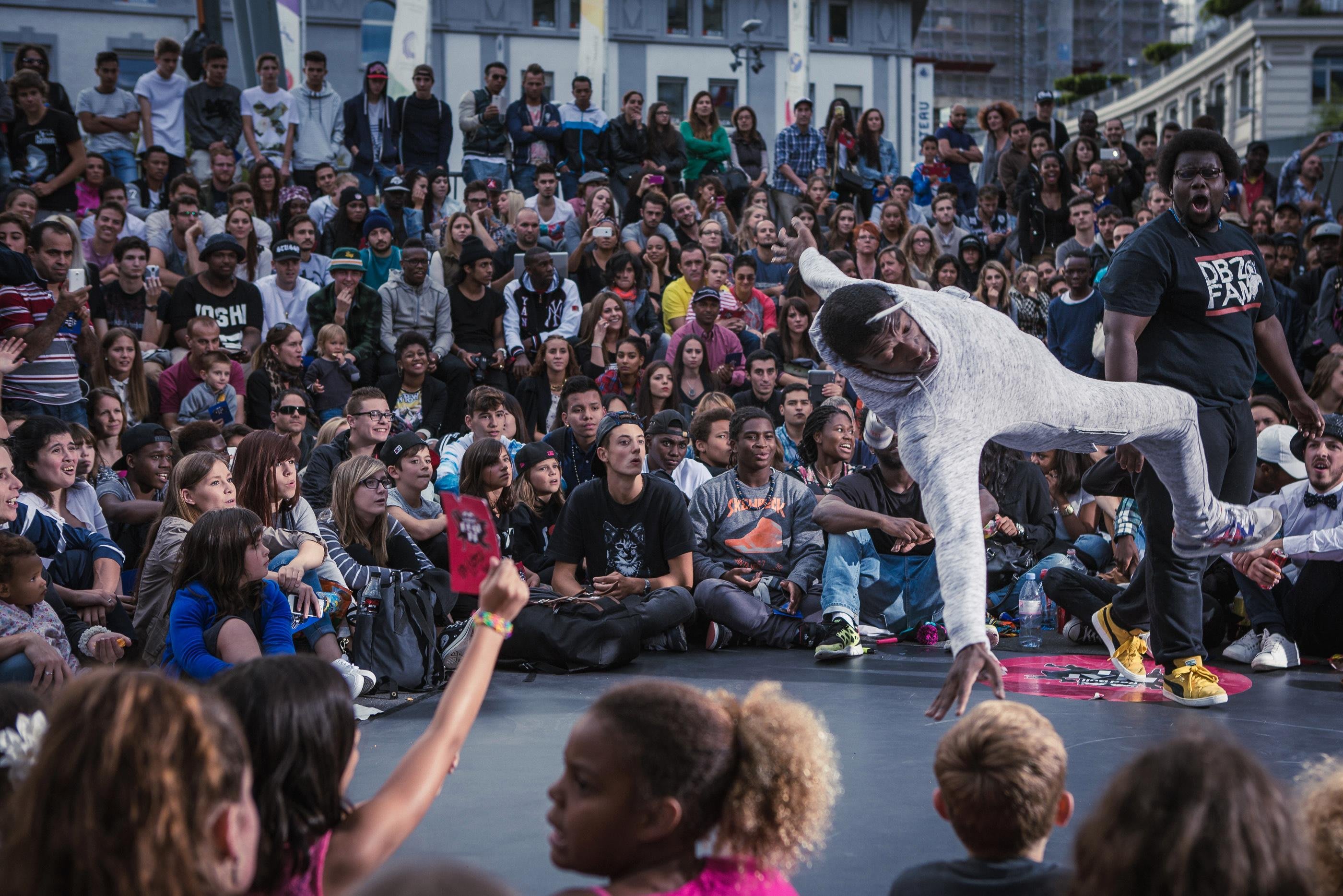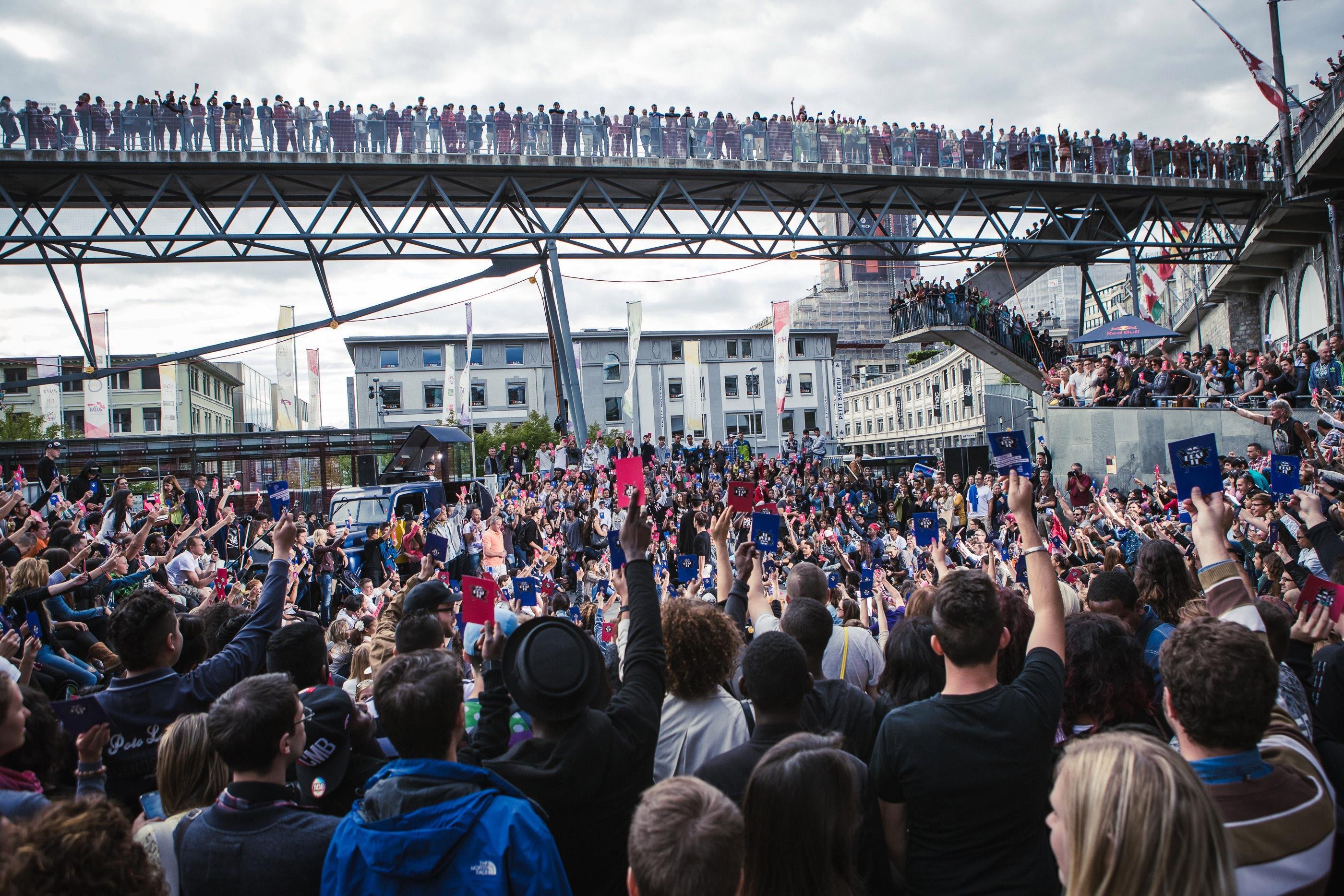 La Place de l’Europe et les ponts qui l’enjambent sont complétement bloqués en cette fin de samedi après-midi. Plus de 2000 spectateurs curieux assistent au rendez-vous de 16 danseurs chevronnés venus de toute la Suisse.
