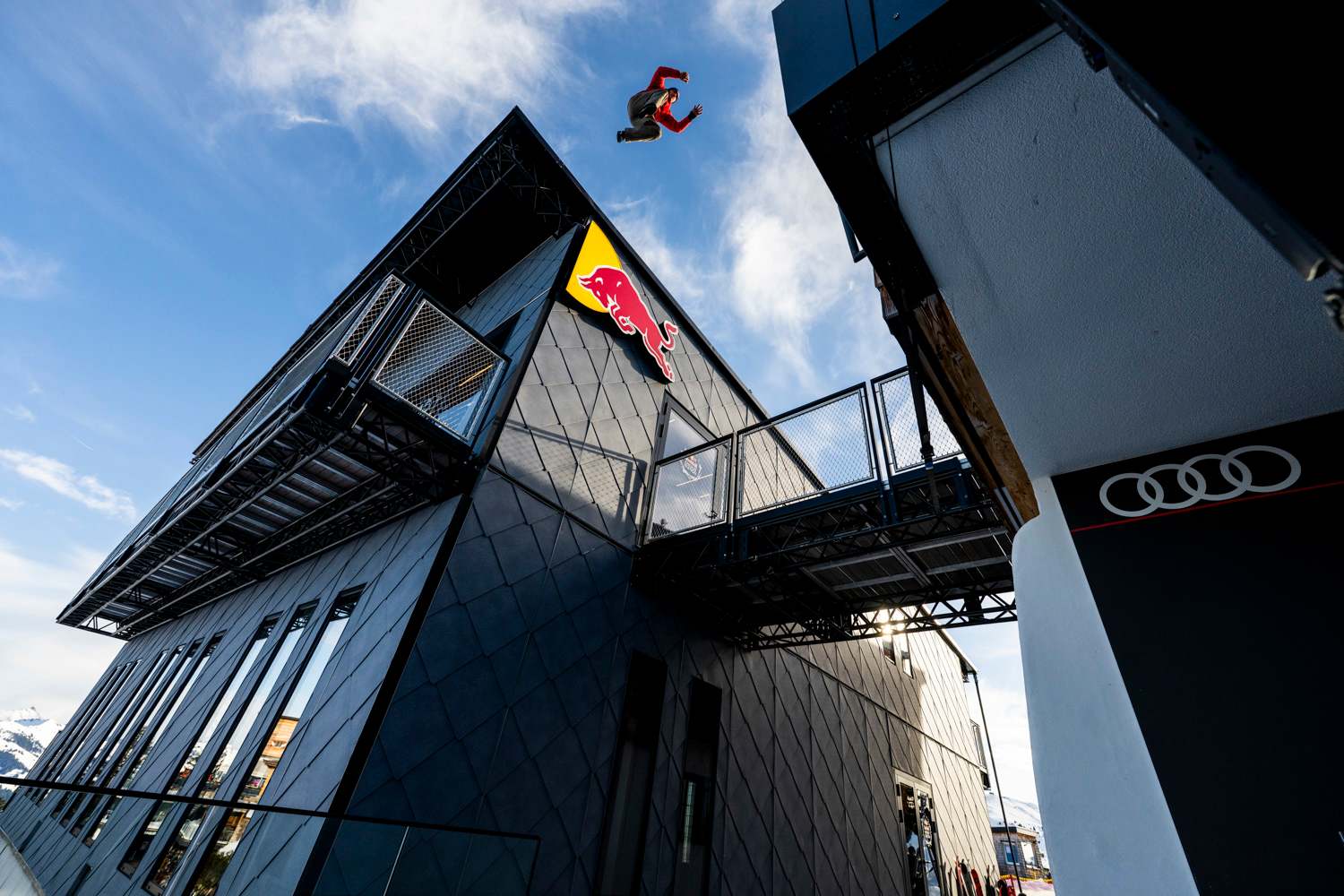 L'un des moments les plus impressionnants de cette mission de parkour à couper le souffle a démarré dans les airs. Jason Paul s'est balancé sur le patin de l'hélicoptère, parfaitement positionné par le pilote de Flying Bulls Mirko Flaim, et a atterri à environ quatre mètres de hauteur sur la Red Bull Energy Station.