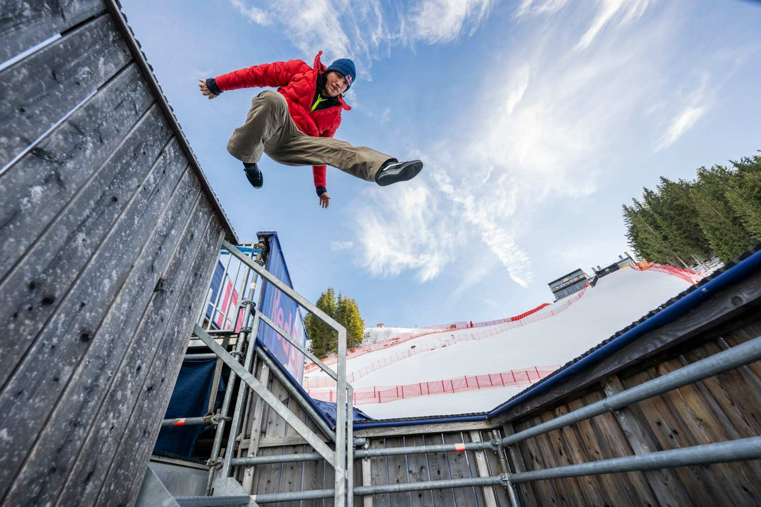 Panorama alpin au lieu d'une skyline urbaine, baskets au lieu des skis, neige et glace au lieu d'asphalte, piste de ski glacée et tribunes mobiles au lieu d'obstacles rigides en béton. Mais une chose reste la même : la Streif ne pardonne aucune erreur. L'impulsion initiale pour ce projet est venue exactement un an auparavant, lorsqu'il a assisté à la descente depuis la Mausefalle. "La Streif a un charisme spécial, l'ambiance de la course était extraordinaire et m'a immédiatement fasciné", se souvient Jason Paul. "Je me trouvais alors dans les tribunes de la Mausefalle et je me suis tout de suite dit : ça ressemble un peu à un spot de parkour. Puis tu regardes en haut de la maison de départ et tu vois ce rooftop - à ce moment-là, le cinéma de la tête a commencé. On réfléchit, on parle, et la vision devient soudain réalité".