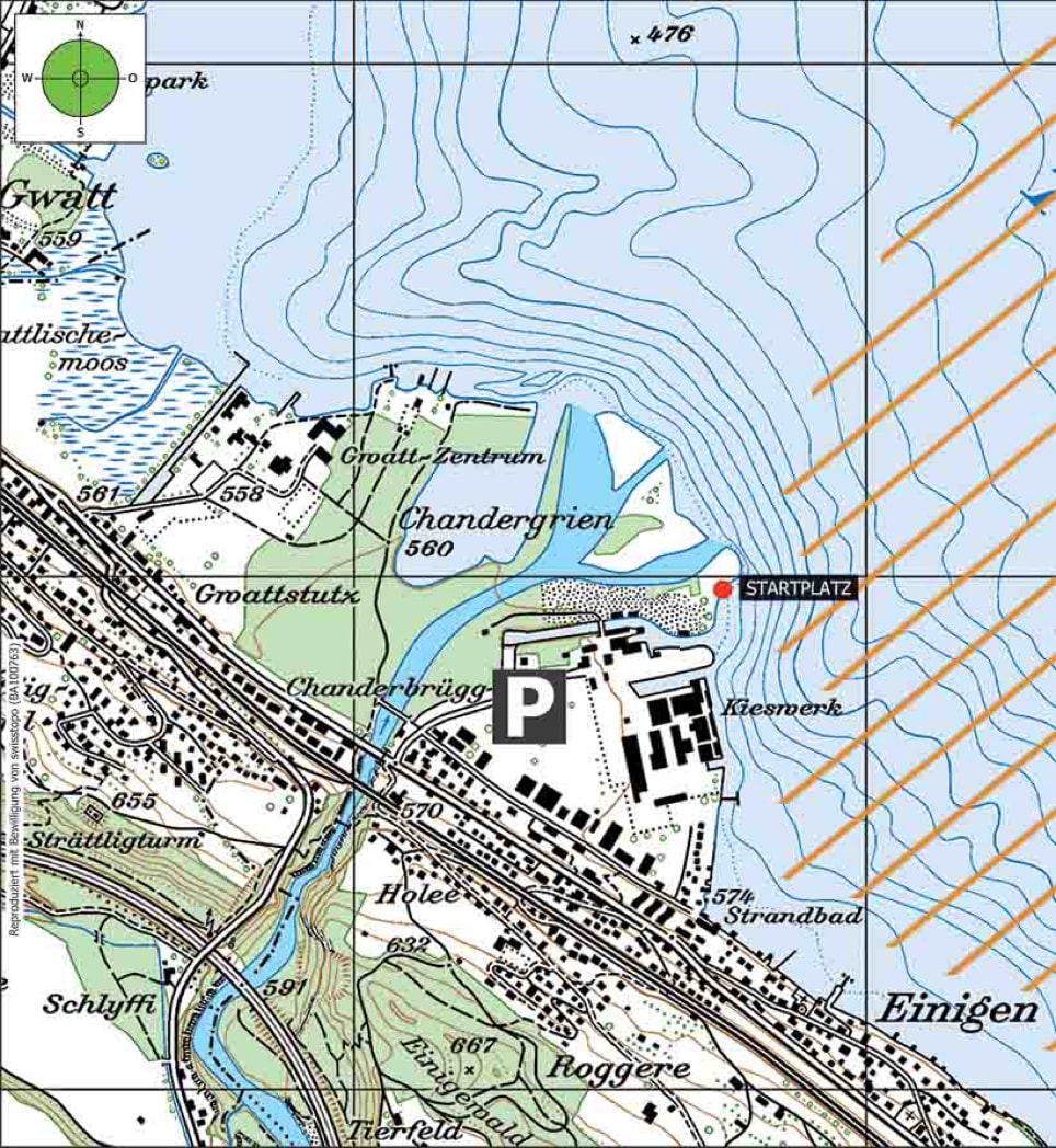 Le spot de kite du lac de Thoune se situe dans le beau paysage du delta du Kander, qui a déposé beaucoup de gravier et de pierres sur la rive là où il se jette dans le lac. Pour ceux qui veulent y faire du kite, le mieux est de se garer sur le parking de l’usine de la gravière d’Einingen. De là, un pont mène à la partie accessible au public du delta du Kander et à l’aire de départ. Si le niveau de l’eau du Kander est normal, la rive offre beaucoup de place pour monter et faire décoller le kite. Mais attention : s’il pleut abondamment dans la région de la Jungfrau, le niveau du Kander peut monter rapidement et inonder l’aire de départ.