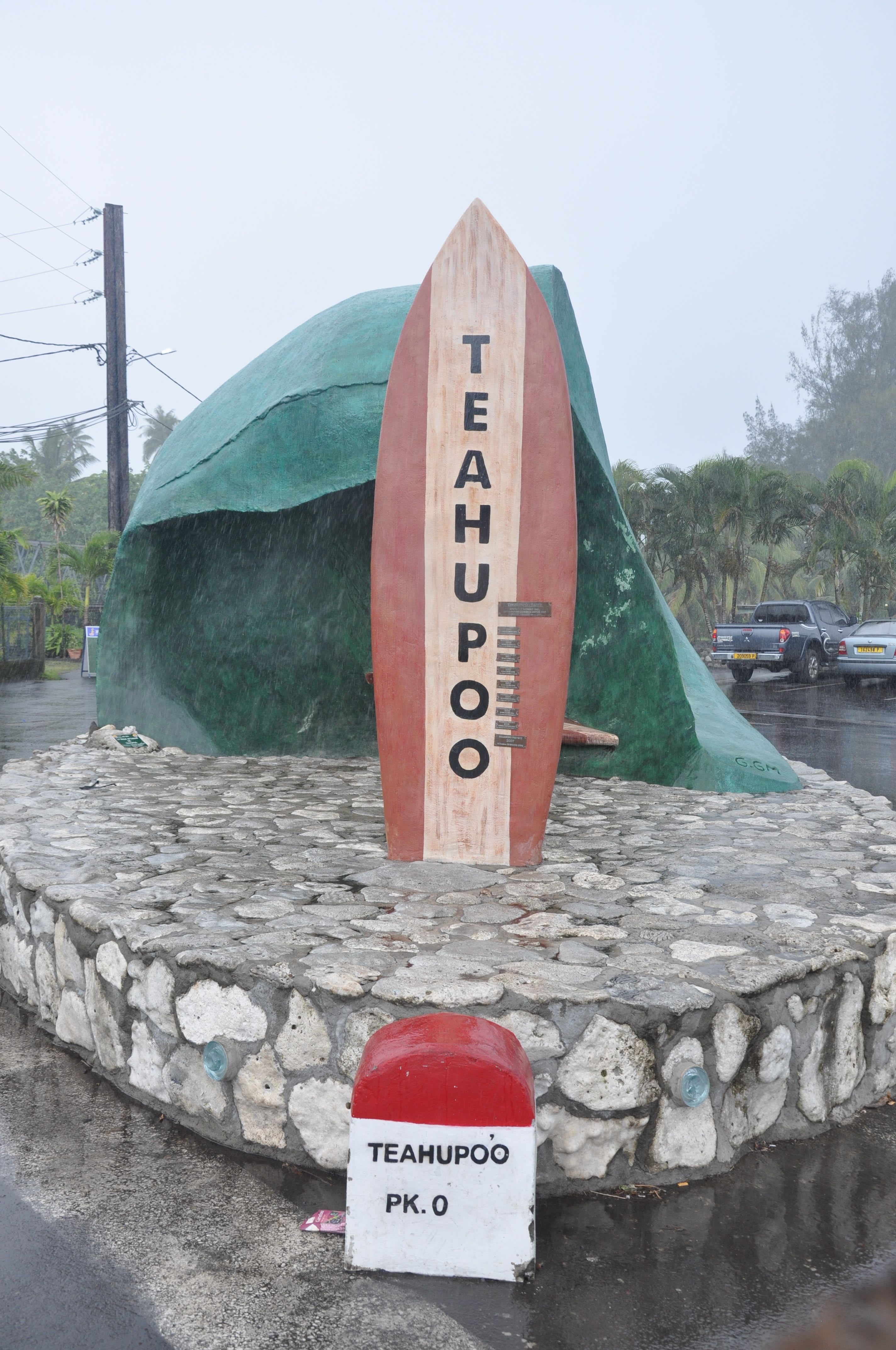 Teahupo’o, c’est avant tout un petit village sauvage situé à la fin de la route de Tahiti. On l’appelle souvent “le boût du monde”. Près de la place du bout de la route, se tient une sculpture en forme de vague. Elle est posée près d'une grande planche de surf en bois plantée dans le sol. Au pied, une borne rouge et blanche mentionne: "PK 0", le kilomètre zéro. Un endroit symbolique, de quoi donner des frissons à tous les surfeurs, même sans se mettre à l’eau.