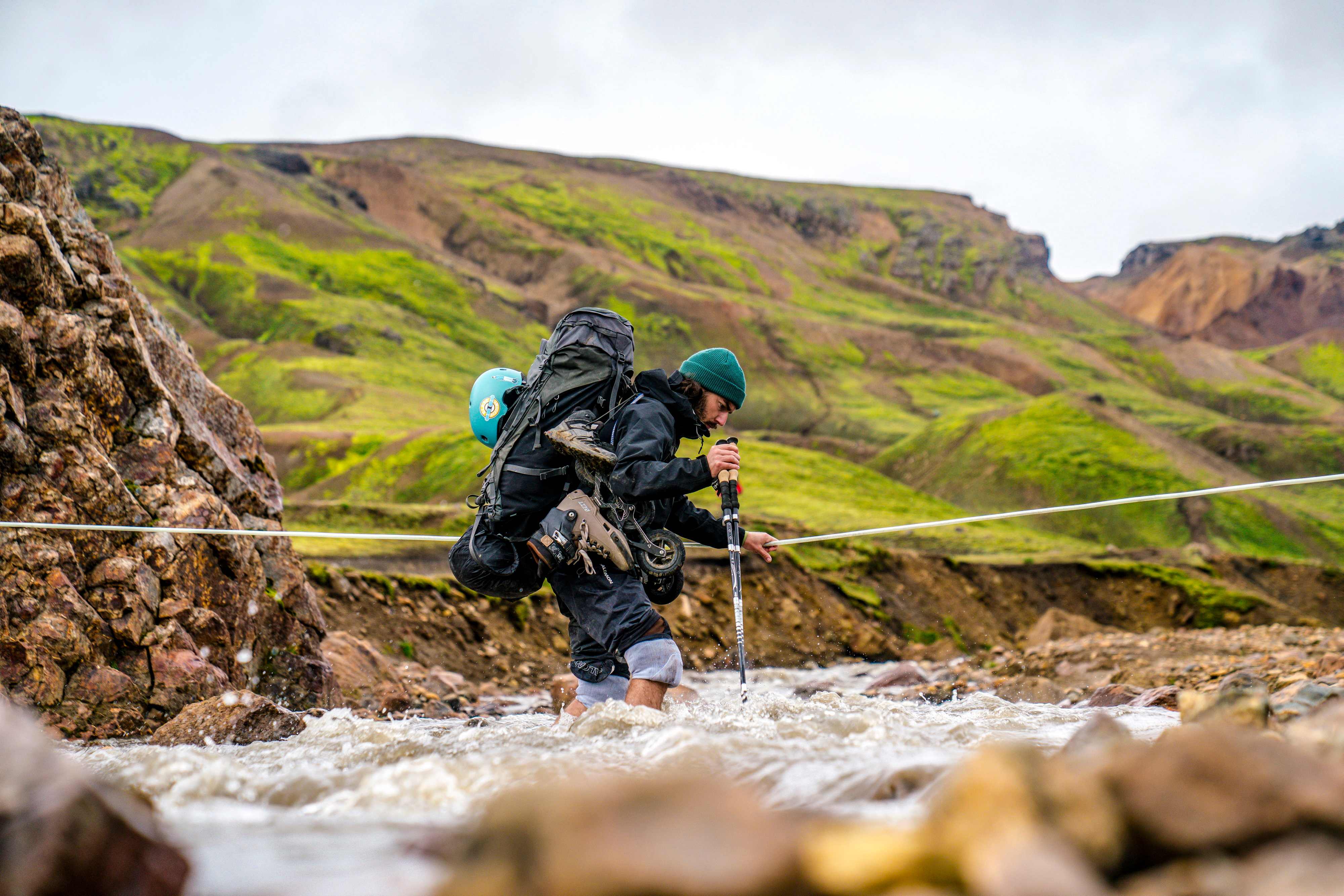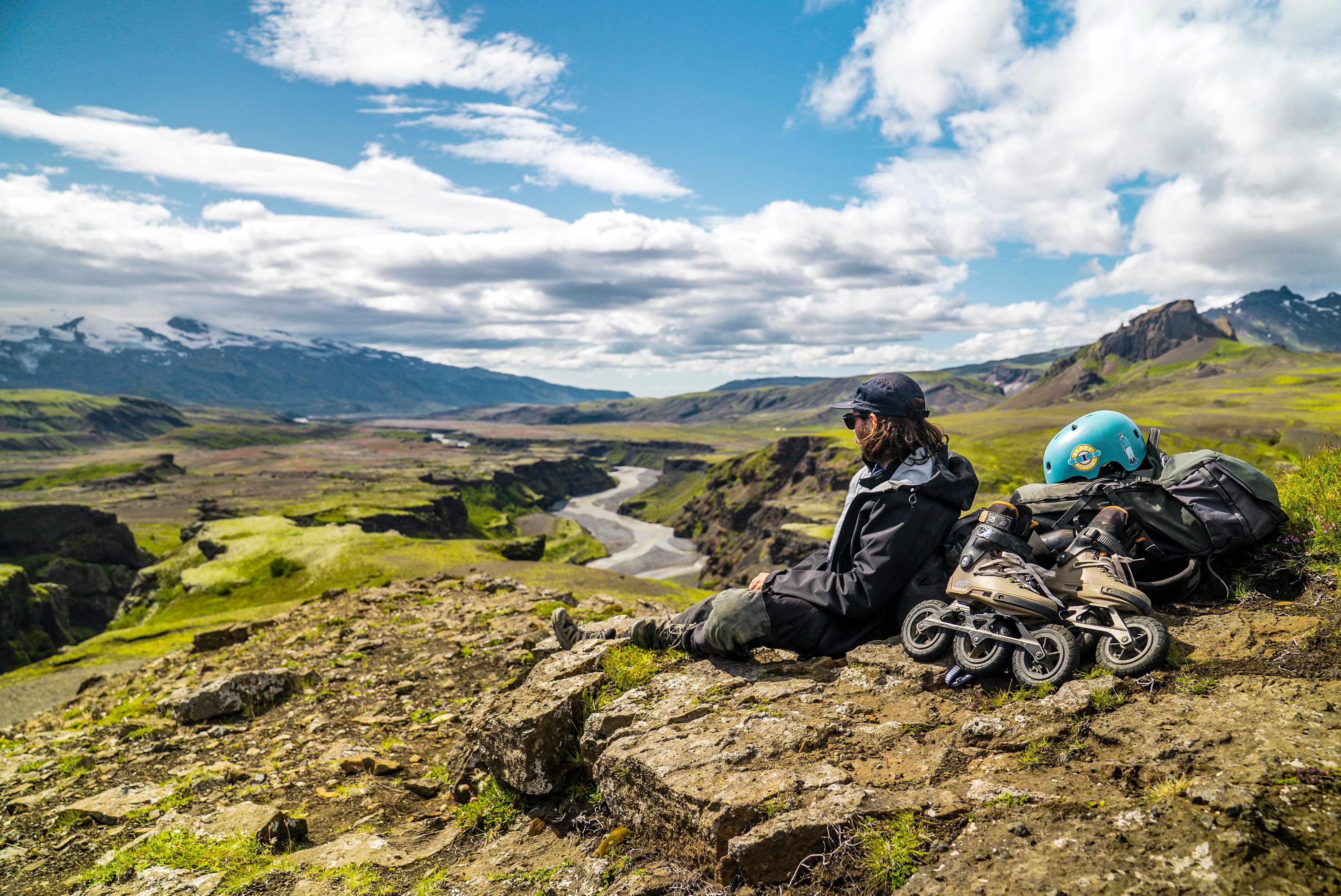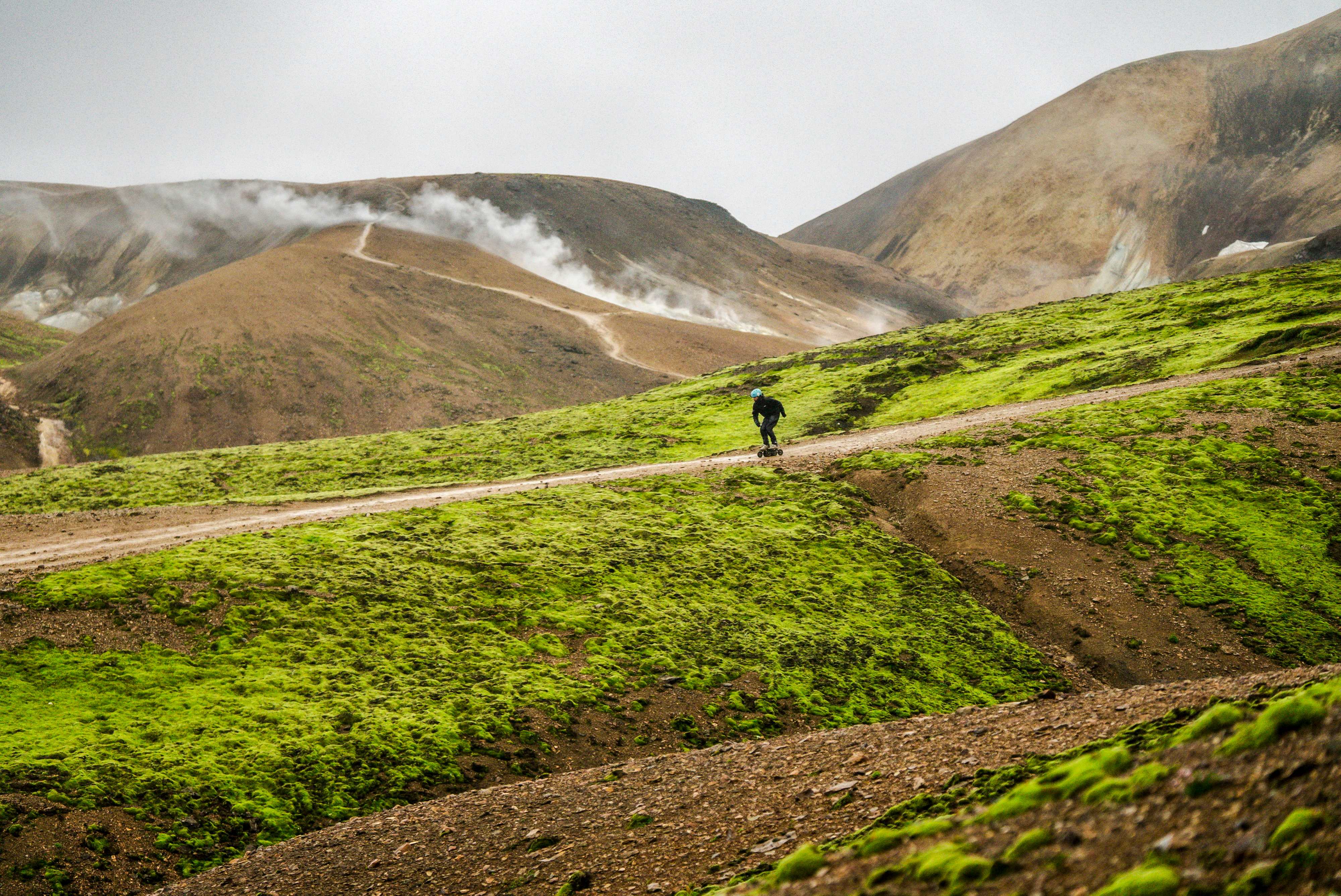 Depuis douze ans que je pratique avec passion le roller tout-terrain, je rêve de parcourir ces 55 kilomètres du sentier Laugavegur à la recherche des spots de roller les plus excitants. Ce trek qui traverse les hauts plateaux islandais au sud de l’île est connu pour ses paysages variés composés de montagnes de rhyolite colorées, de champs de lave, de déserts de sable noir et de glaciers, avec des défis particuliers tels que la traversée de rivières et bien sûr des conditions météorologiques changeant en un clin d’œil. Je ne voulais pas découvrir tout cela à pied, mais sur mes rollers.
