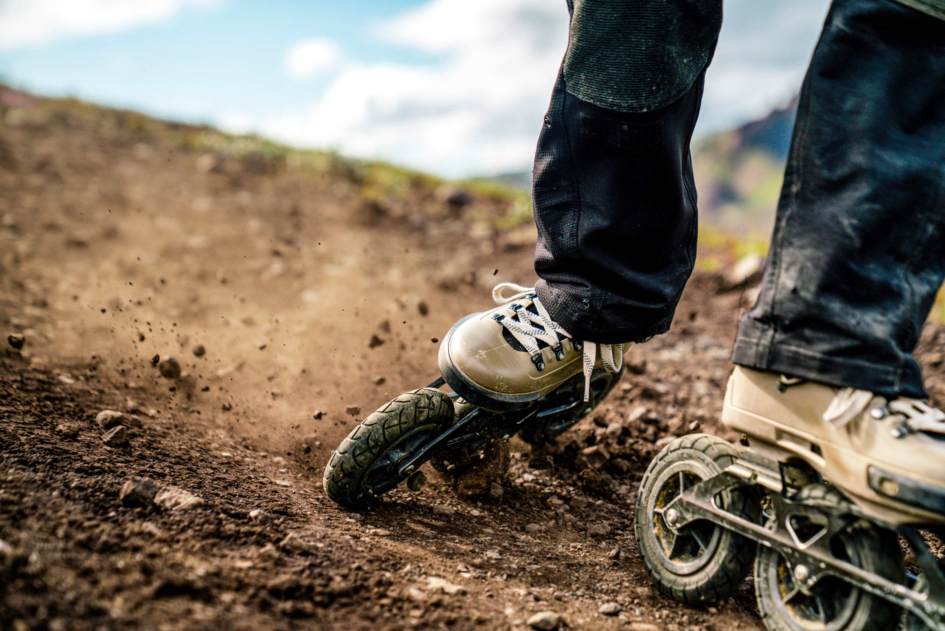 Il n’existe dans le monde qu’une poignée de patineurs tout-terrain et trois marques qui fabriquent l’équipement nécessaire (dont ma favorite, une marque allemande : Powerslide). Il se compose d’une botte de roller classique à coque rigide avec un châssis en aluminium. Trois roues tout-terrain, montées sur une platine et semblables à des mini-roues de VTT, sont remplies d’air. Les patins pèsent au total 4,5 kilos. Que dire : cette aventure s’annonce assez intense !