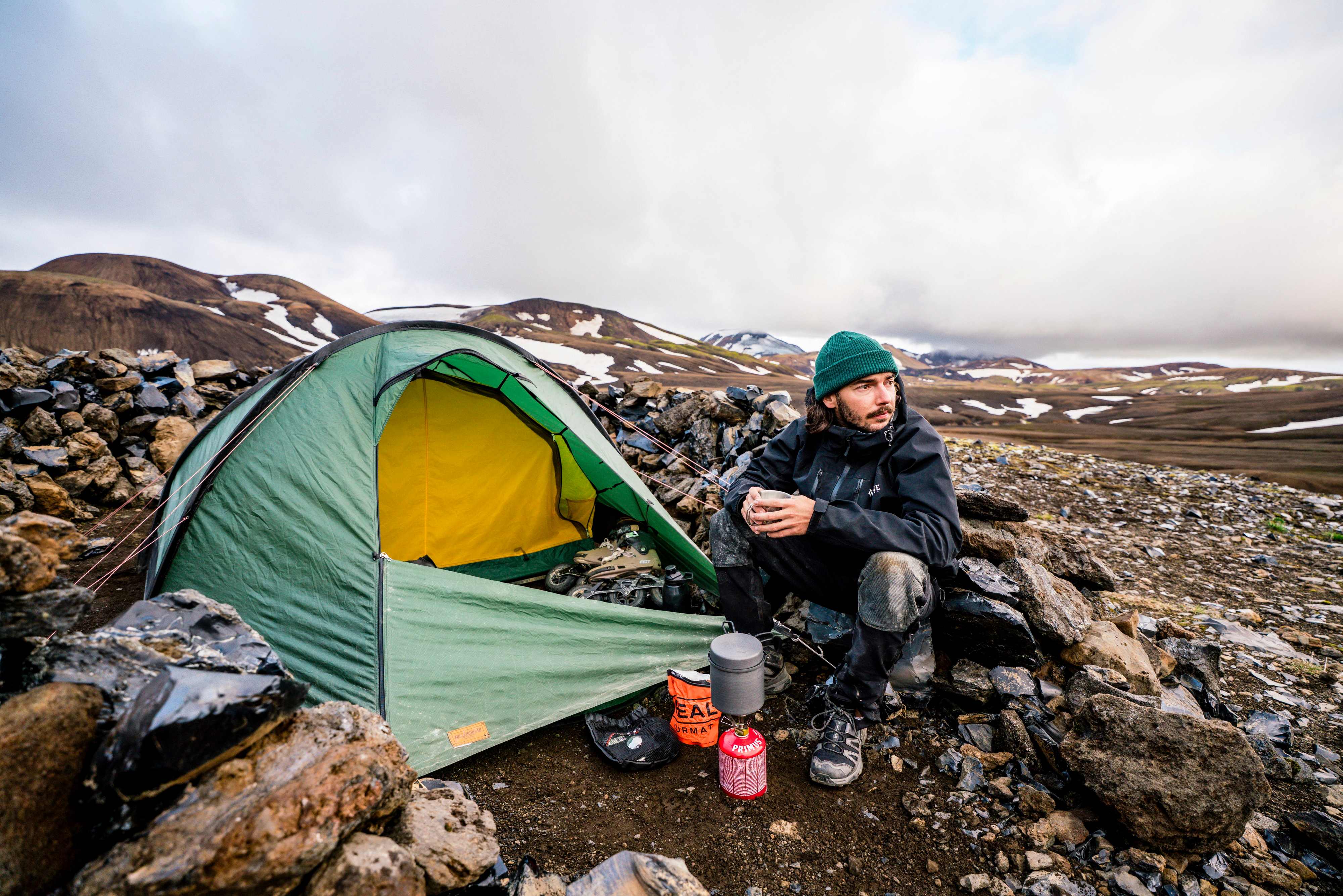 La nouvelle de notre arrivée se répand rapidement parmi les randonneurs d’Afrique du Sud, des États-Unis, d’Islande et d’Israël qui empruntent le sentier en même temps que nous. Nous avons été accueillis avec curiosité, et examinés de près : nous, c’est Pascal, le type avec l’appareil photo et ses 16 batteries, et 9 batteries de drone, et Björn (moi), le fou sur des rollers avec 26 kilos de bagages sur le dos, dont une tente, de la nourriture pour sept jours et tout un tas de matériel.