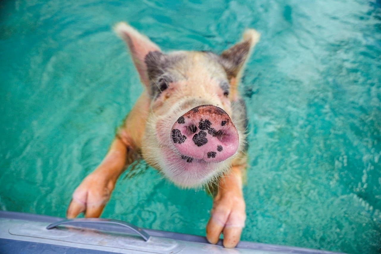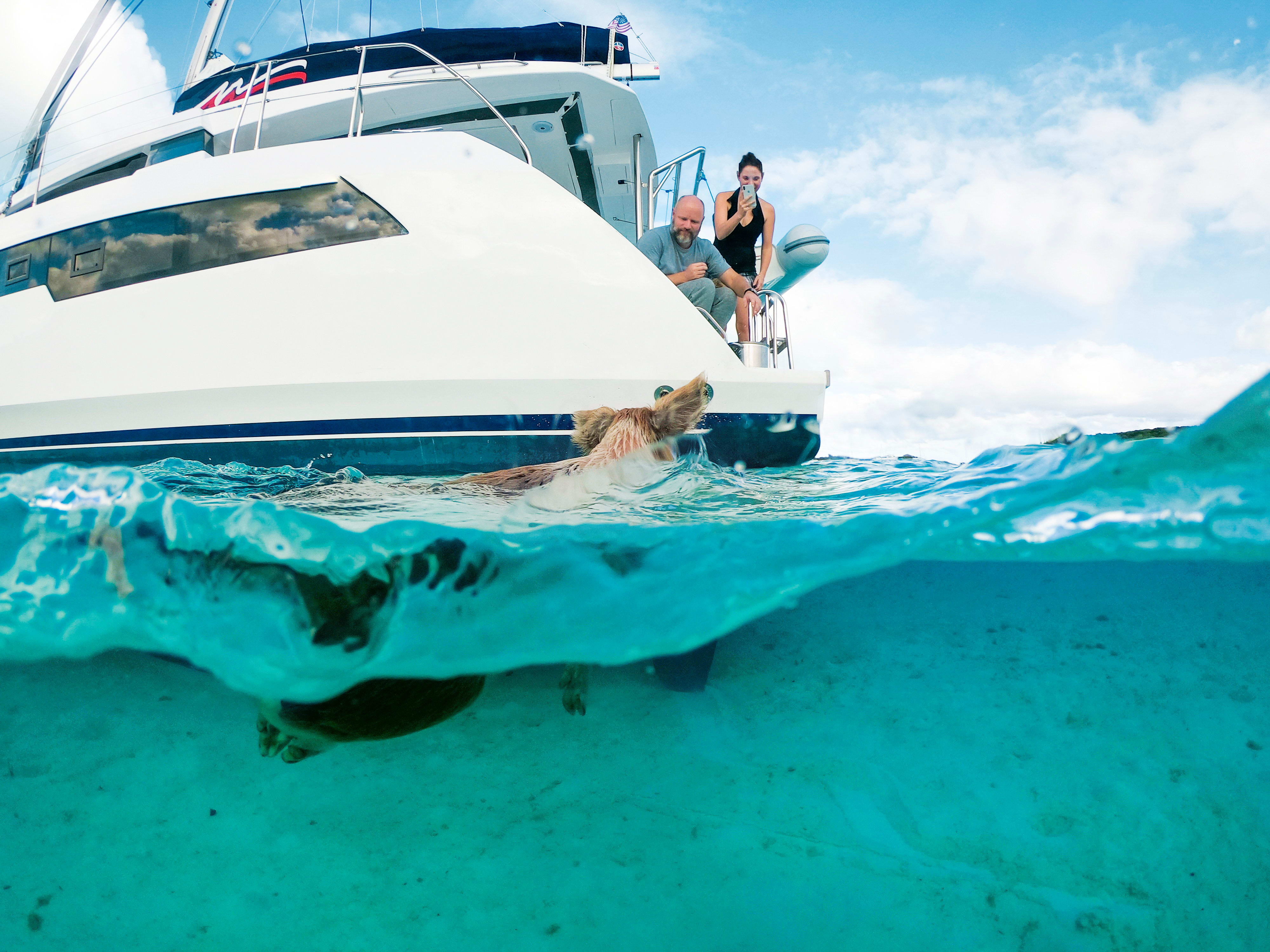 Les puristes le consomment cru en salade aigre-douce, ce que nous n’oserons faire que quelques jours plus tard lors de notre détour par la civilisation pour observer les cochons nageurs de Big Major Cay. Ces coquins roses et dodus viennent déjà à la rencontre de notre annexe, le plus grand d’entre eux tente même un abordage. Heureusement, nous avons encore des restes de notre étape au parc national (où règne une stricte politique de no-take-no-leave), ce qui nous permet de faire diversion. Ils dévorent joyeusement nos restes de melon et de pâtes, puis, rassasiés, se laissent caresser et posent pour la photo.