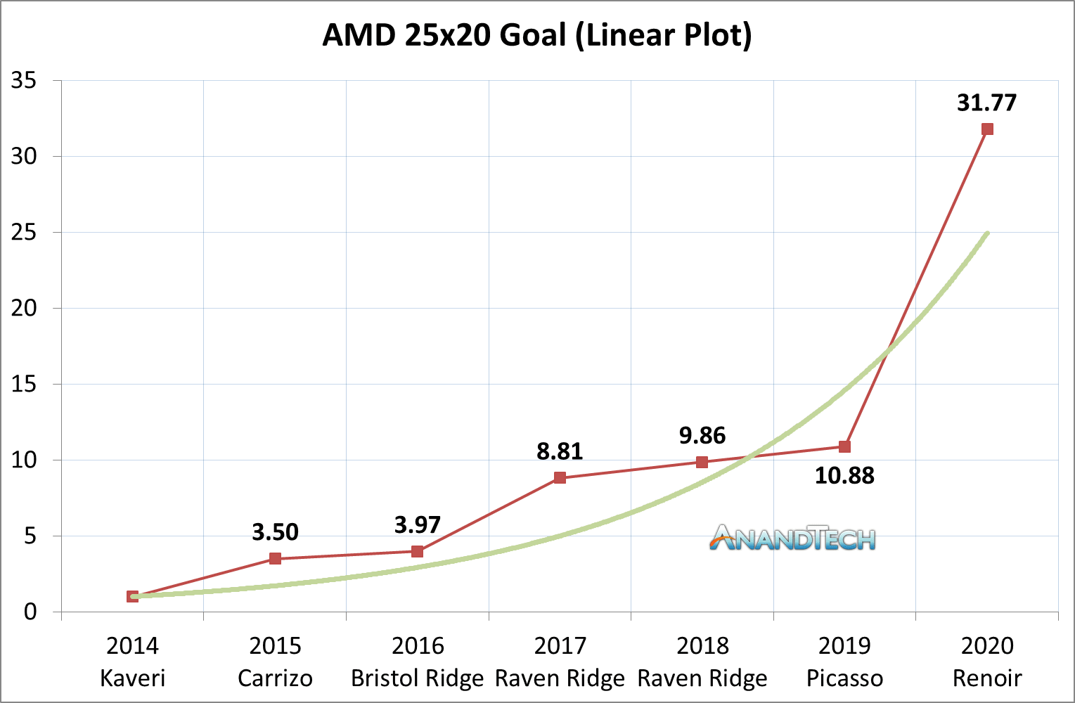 Kaveri est pour référence le nom de code des puces mobiles, utilisant l’architecture Steamroller qui succéda à Jaguar, se trouvant au coeur de la Xbox One et PS4. Renoir, dernière itération mentionnée sur ce graphique est le nom de code des puces pour ordinateurs portables d’AMD basés sur l’architecture Zen 2 susmentionnée. On la retrouve par exemple dans la gamme Ryzen 4000 Mobile.