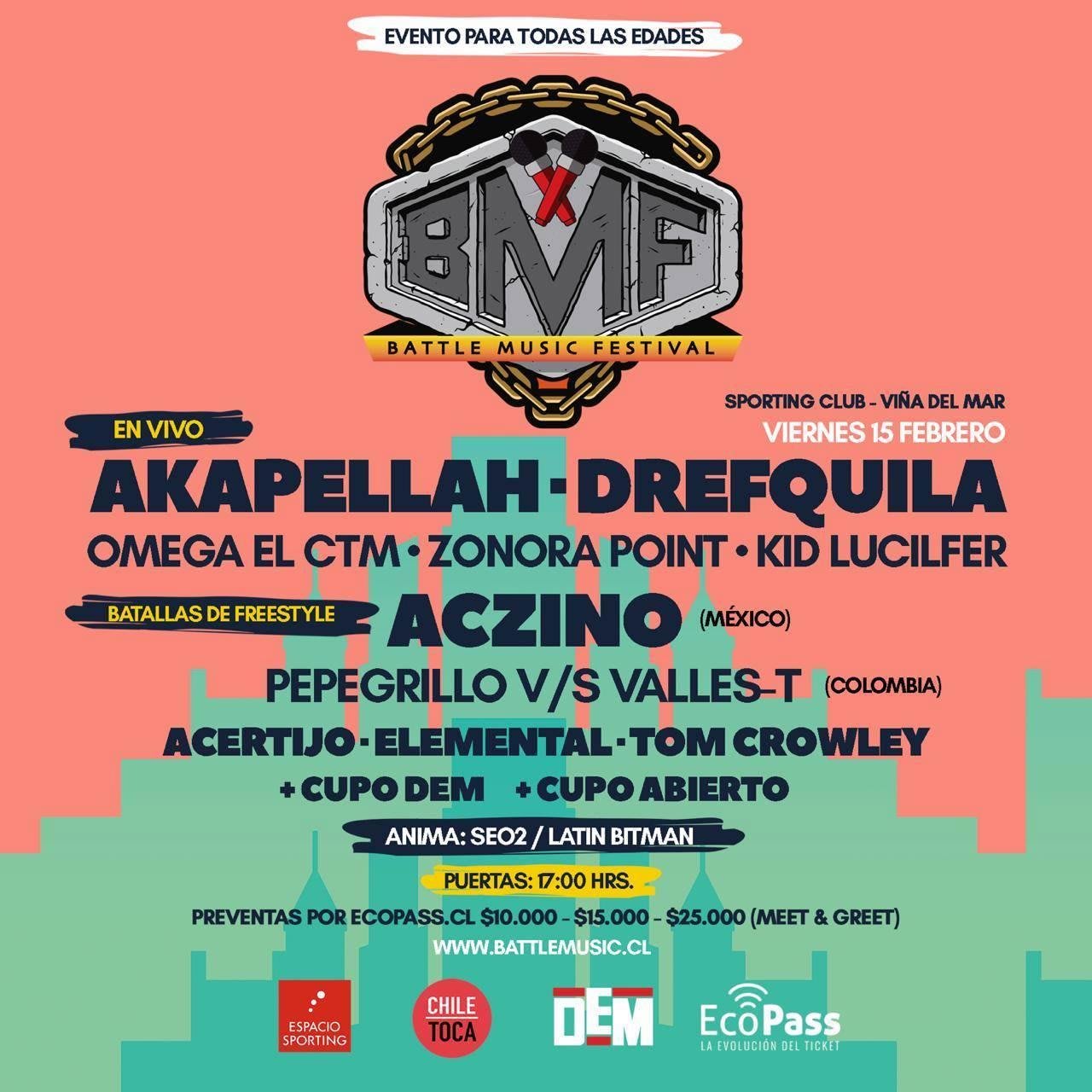 Battle Music Festival (BMF) es el evento encargado de juntar a los exponentes de la cultura urbana en un mismo lugar con presentaciones en vivo y batallas de freestyle que serán animadas por Seo2 y Latin Bitman.
