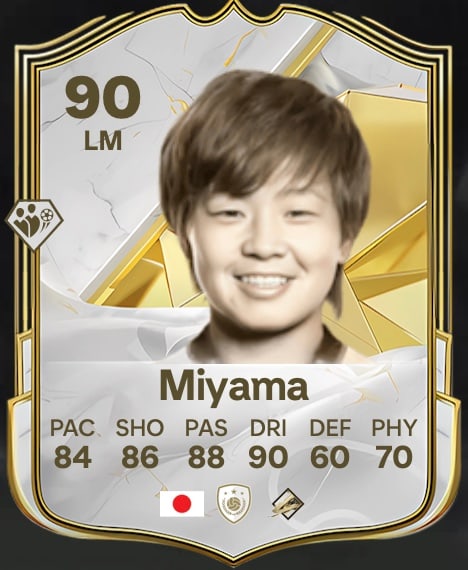 El icono de Aya Miyama también tiene una valoración global de 90. La ex capitana de la selección femenina japonesa pasó la mayor parte de su carrera en su país natal, con un par de breves estancias en Estados Unidos. Sus mayores éxitos fueron ganar el Mundial con Japón en 2011 y el Campeonato Asiático tres años después, donde también fue galardonada como la mejor jugadora del torneo.