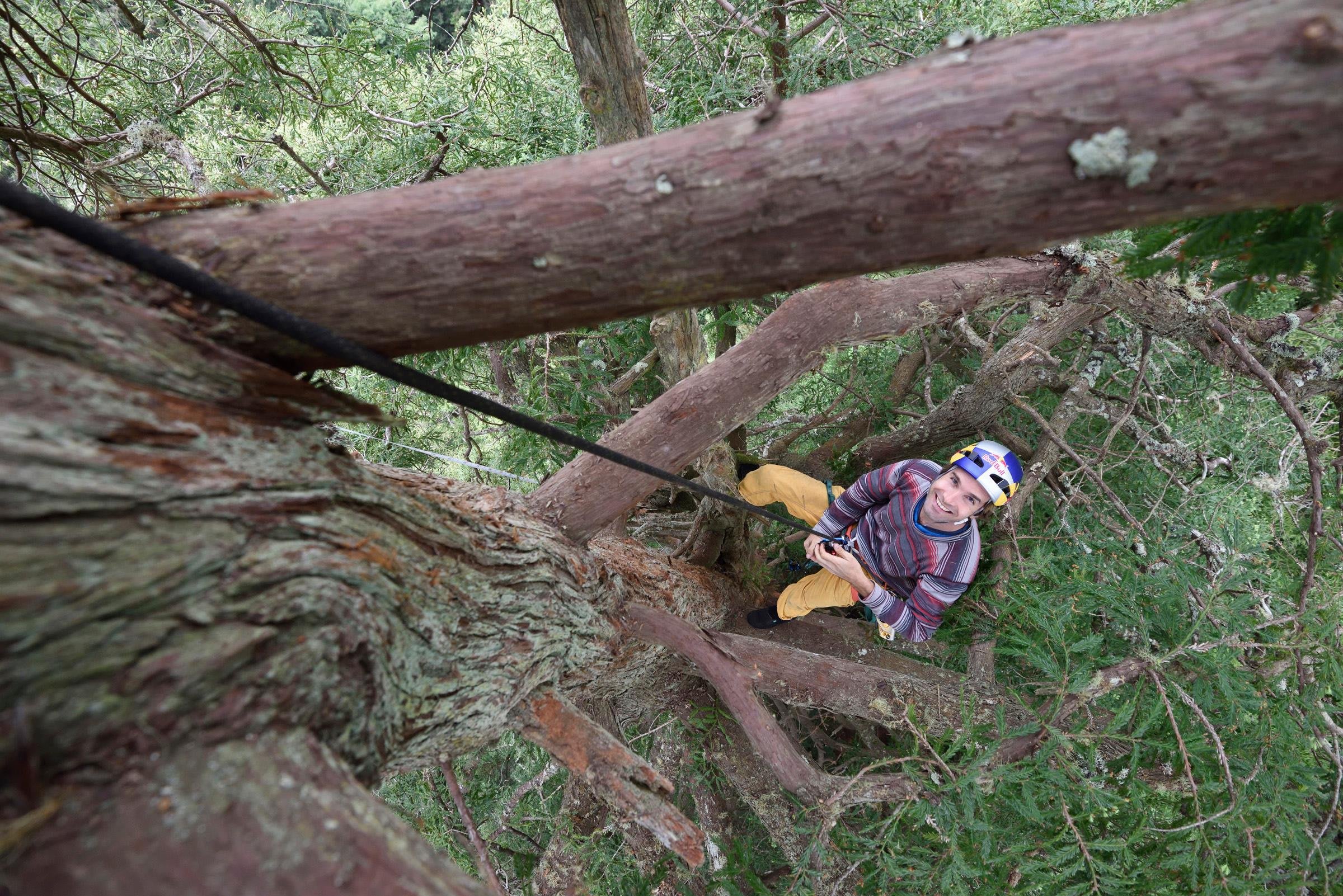 "El árbol que eligió Chris era bueno porque estaba marcado por el fuego", dijo Ambrose, quien estimó que el árbol tendría como unos 600 o 700 años. "En el tronco no tenía ni muchos líquenes ni musgo y la corteza se veía fuerte. Pero, precisamente por eso, las fisuras y surcos no eran tan profundos y sobresalían. Eso hizo que la subida fuera dura. ¡Estaba súper emocionado!".