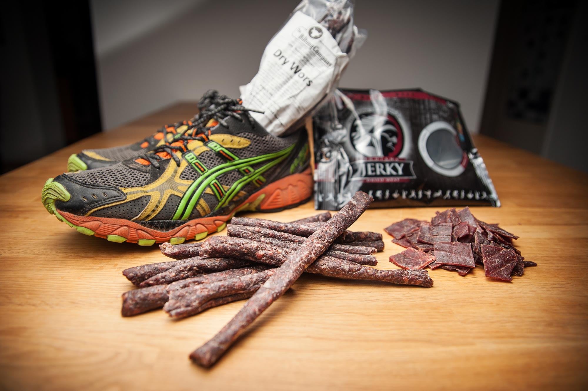 越野跑传奇Ryan San在Drakensberg山跑得没日没夜时,最喜欢吃些有嚼劲的东西——南非口味的牛肉干,这在跑者间是相当热门的食物。咸咸的零食重量超轻,却富含身体可以补充体力的蛋白质与热量。