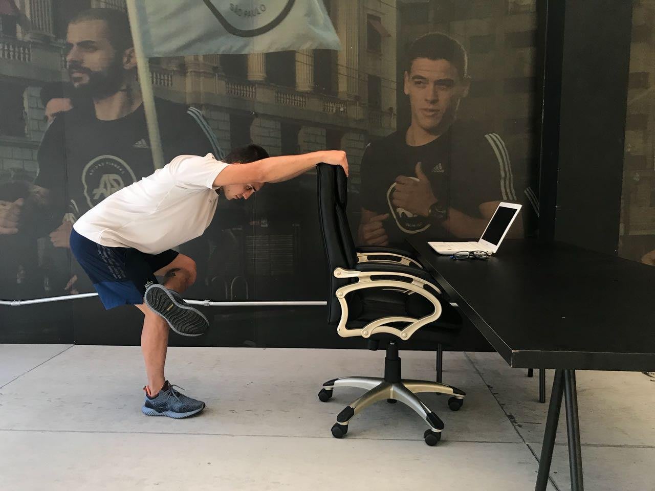 用站姿并将背部挺直,运用单手抓住脚背并将脚向上拉,同时,膝关节弯曲垂直朝下并让脚跟接近臀部,如果单脚站立的姿势不稳定时,可单手扶墙或稳定的工具。