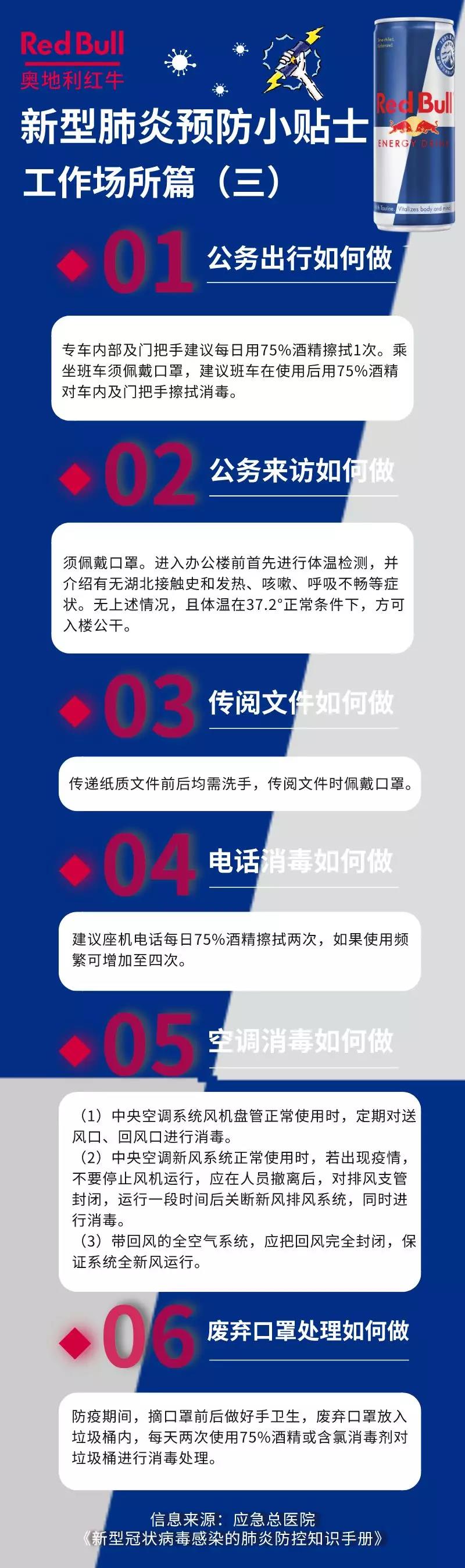保持办公区环境清洁,建议每日通风3次,每次20-30分钟,通风时注意保暖。人与人之间保持1米以上距离,多人办公时佩戴口罩。保持勤洗手、多饮水,坚持在进食前、如厕后按照六步法严格洗手。接待外来人员双方佩戴口罩。
