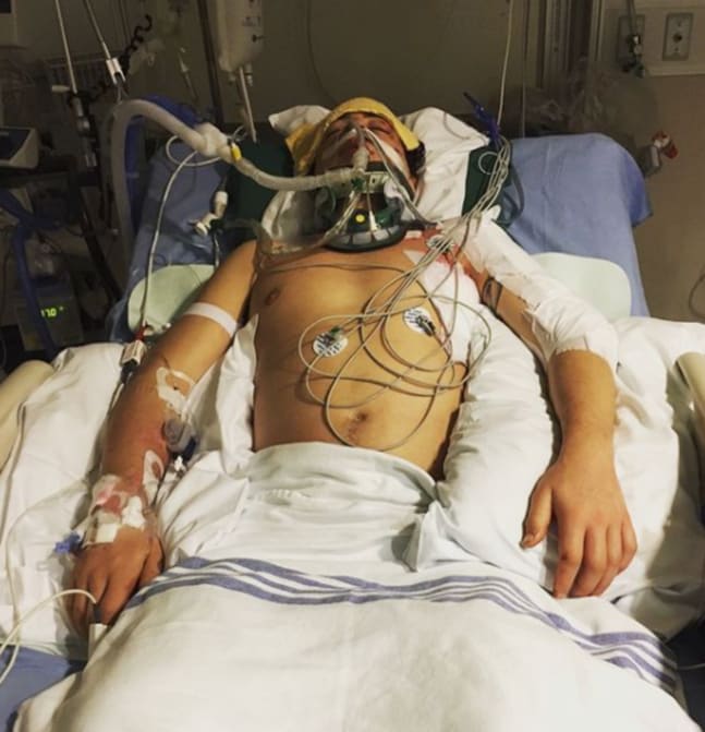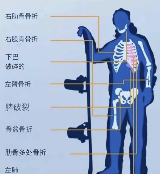 这次意外导致他下巴、左臂、骨盆、肋骨等多达17处骨折,另外伴有脾脏破碎与肺组织萎缩等症状。