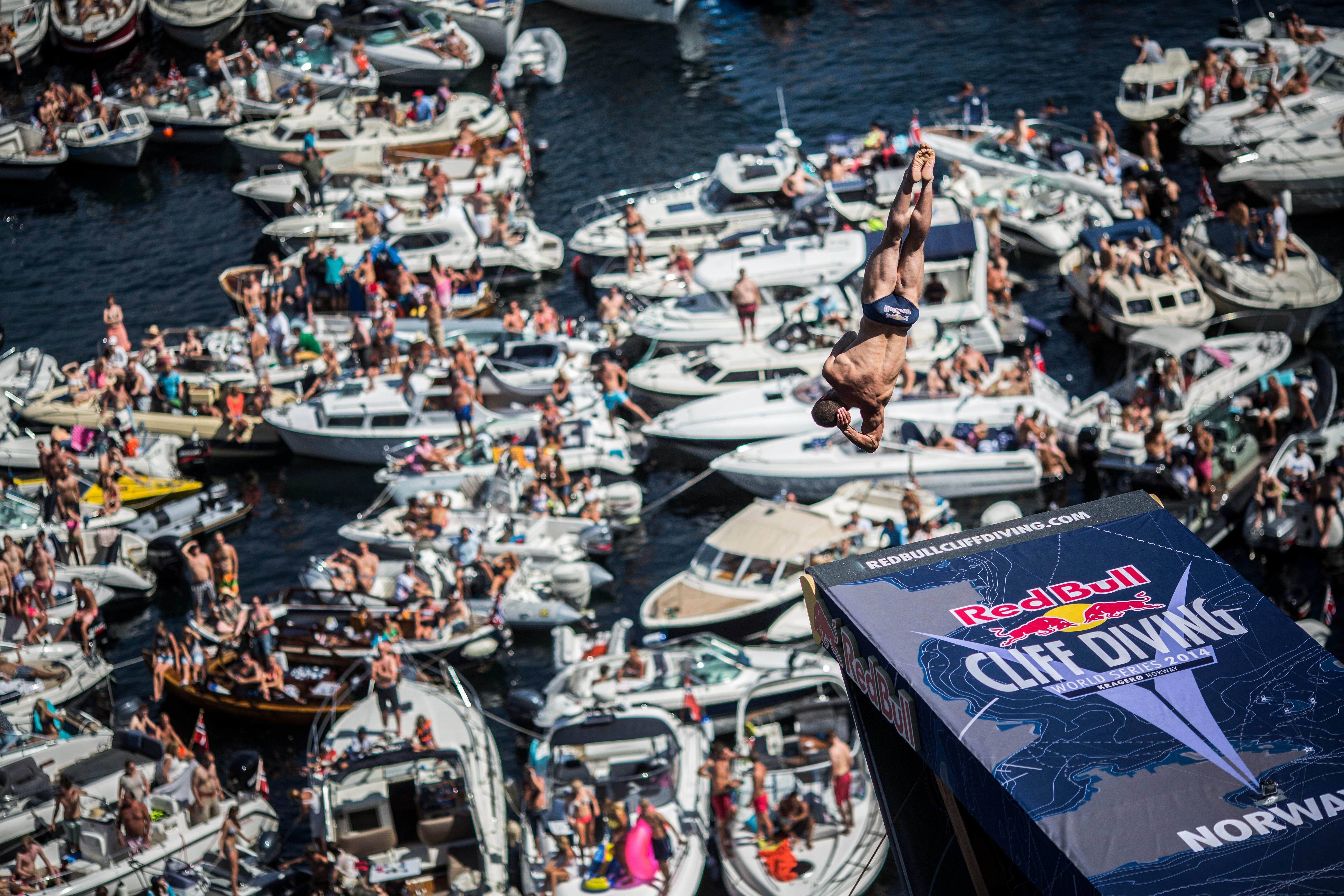 挪威克拉格勒(Kragerø)举行的Red Bull 悬崖跳水全球系列赛,历经精采绝伦的激战后,英国籍的Gary Hunt仍以高超的技巧领先群伦连三冠,美国籍的Rachelle Simpson 在女子组蝉联二连胜。请观赏本站赛程精采花絮介绍。