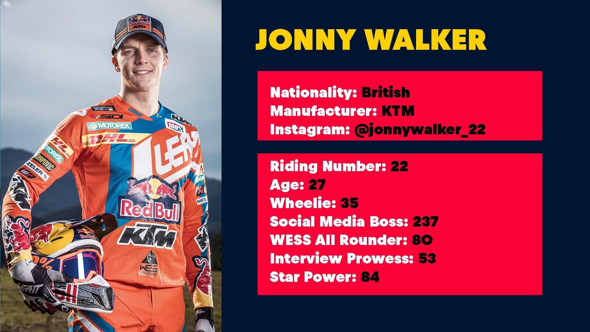 Jonny Walker tiene las habilidades para dar y tomar. Un sólido todoterreno de WESS capaz de salvar cualquier dificultad en cualquier lugar. Prefiere evitar ser el centro de atención y en su lugar deja que su forma de pilotar sea la que hable. A pesar de un par de años de lesiones, Walker ha vuelto a su mejor nivel.