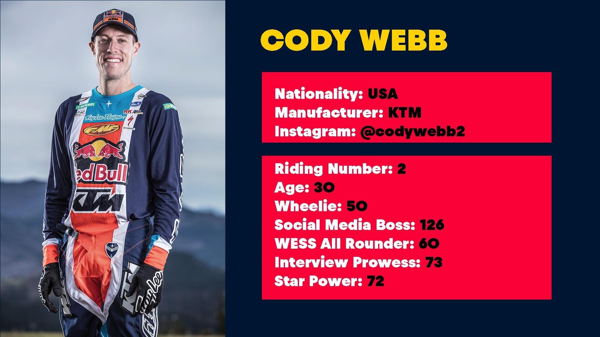 Cody Webb puede presumir de tener las piernas más largas del paddock, pero también sabe cuando sacarlas para usarlas. Lo han sacado de muchas situaciones difíciles y ha subido al podio. Antiguo piloto de trial, que se decantó por el endurocross, no ha dejado de desarrollar la amplia gama de habilidades que requiere el WESS.
