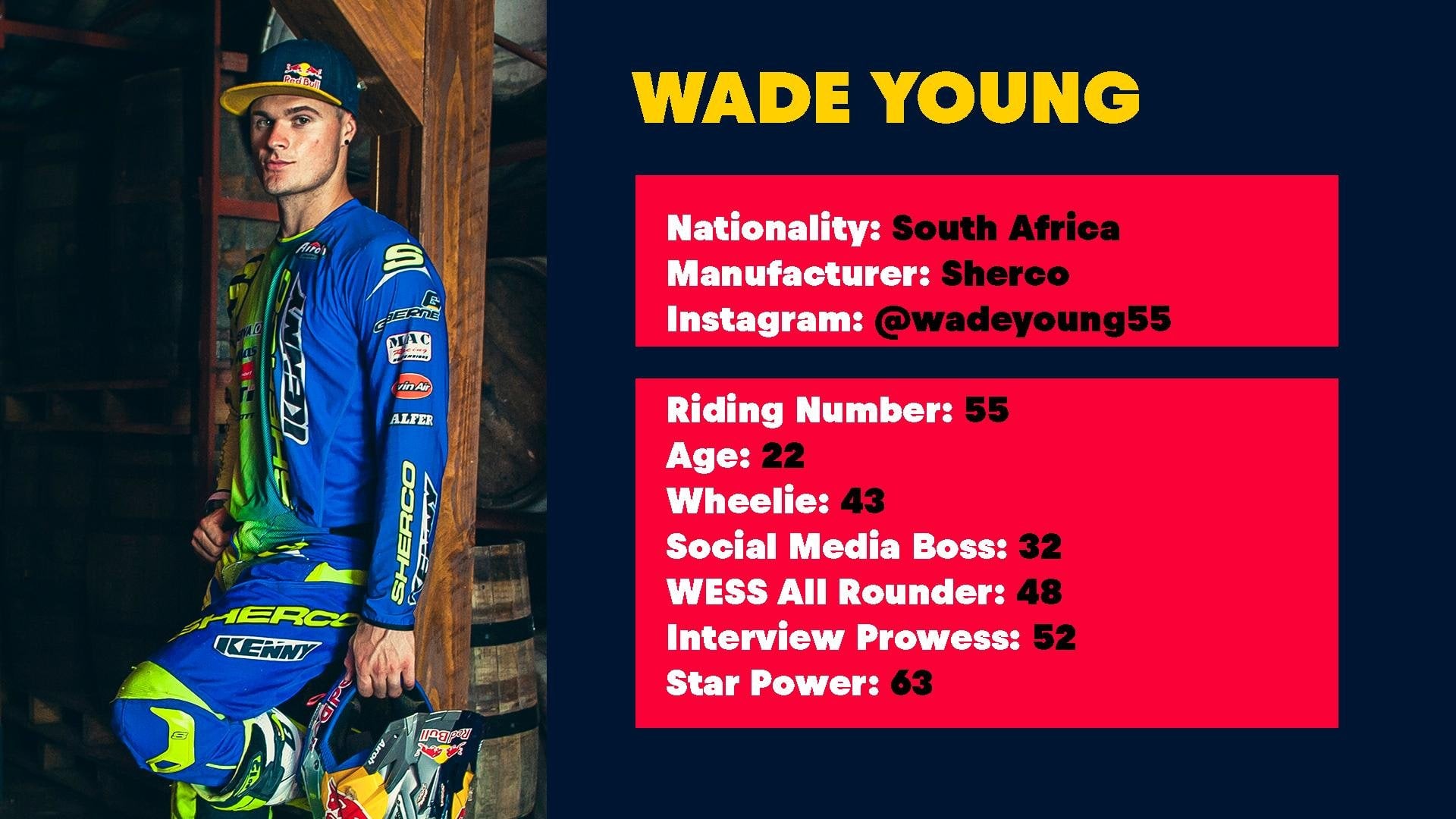 Directamente de Sudáfrica, Wade Young es tan duro como parece. Para un piloto que no tiene las habilidades de trial de sus rivales, lo compensa con una fuerza brutal. Capaz de tirar con fuerza ante cualquier situación, Wade ya sabe que es ganar en un hard enduro y, sin lugar a dudas, pegará duro a todo aquel que se interponga en su camino para imponerse en el nuevo World Enduro Super Series.