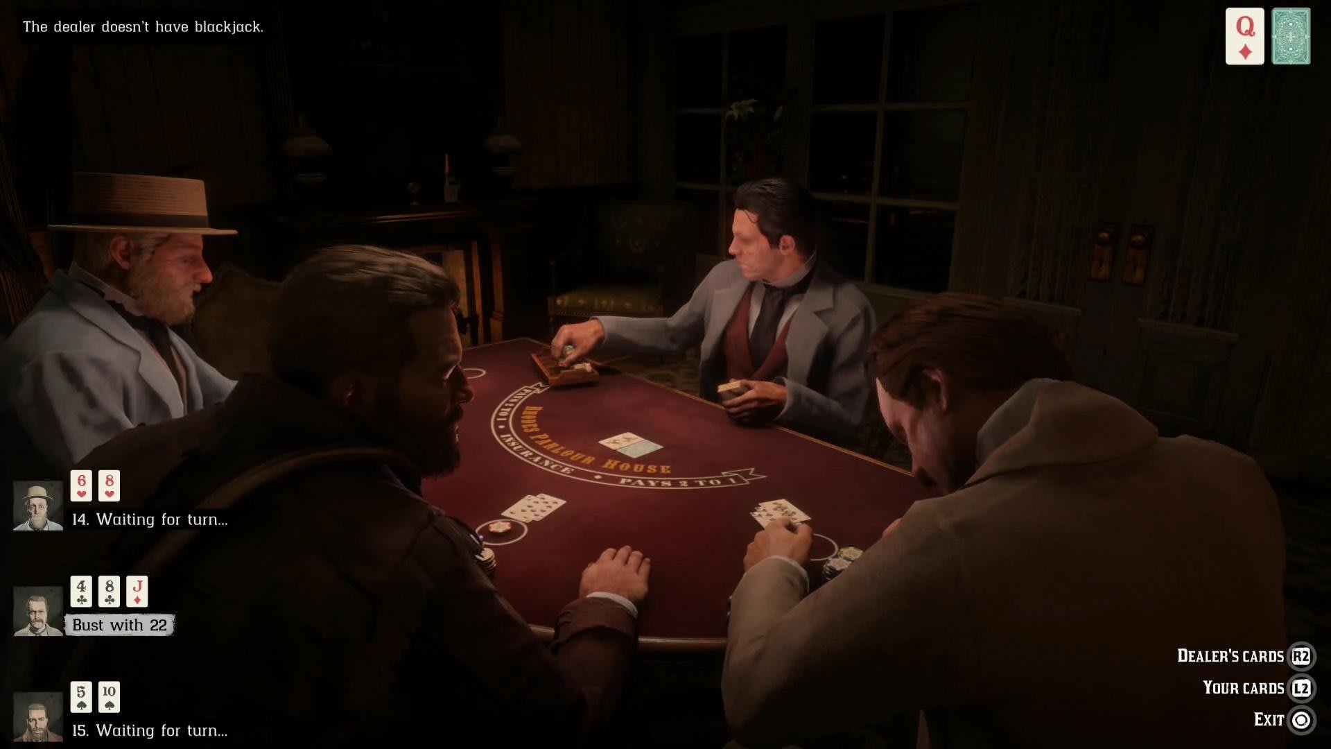 Es fácil perder un buen montón de horas con este clásico. Sentarse a una mesa y subir la apuesta unos pocos centavos es tentador, pero a medida que progresas vas a tener más dinero y vas a tener más confianza en ti mismo. No explicaremos todas las reglas aquí, pero basta con decir que la idea es jugar tus cartas si tienes una buena mano (trío, doble pareja, full, etc.), y marcar un farol y rezar que no te pillen... Al principio te enfrentarás a rivales fáciles que se cruzarán de brazos ante la más mínima provocación, y suponemos que, si es necesario, podrías robarles después de perder de todos modos. No pases mucho tiempo con una mano que está destinada a fallar, plántate y ahorra dinero. Asegúrate de tener por lo menos una pareja decente de inicio antes de poner dinero encima de la mesa.
